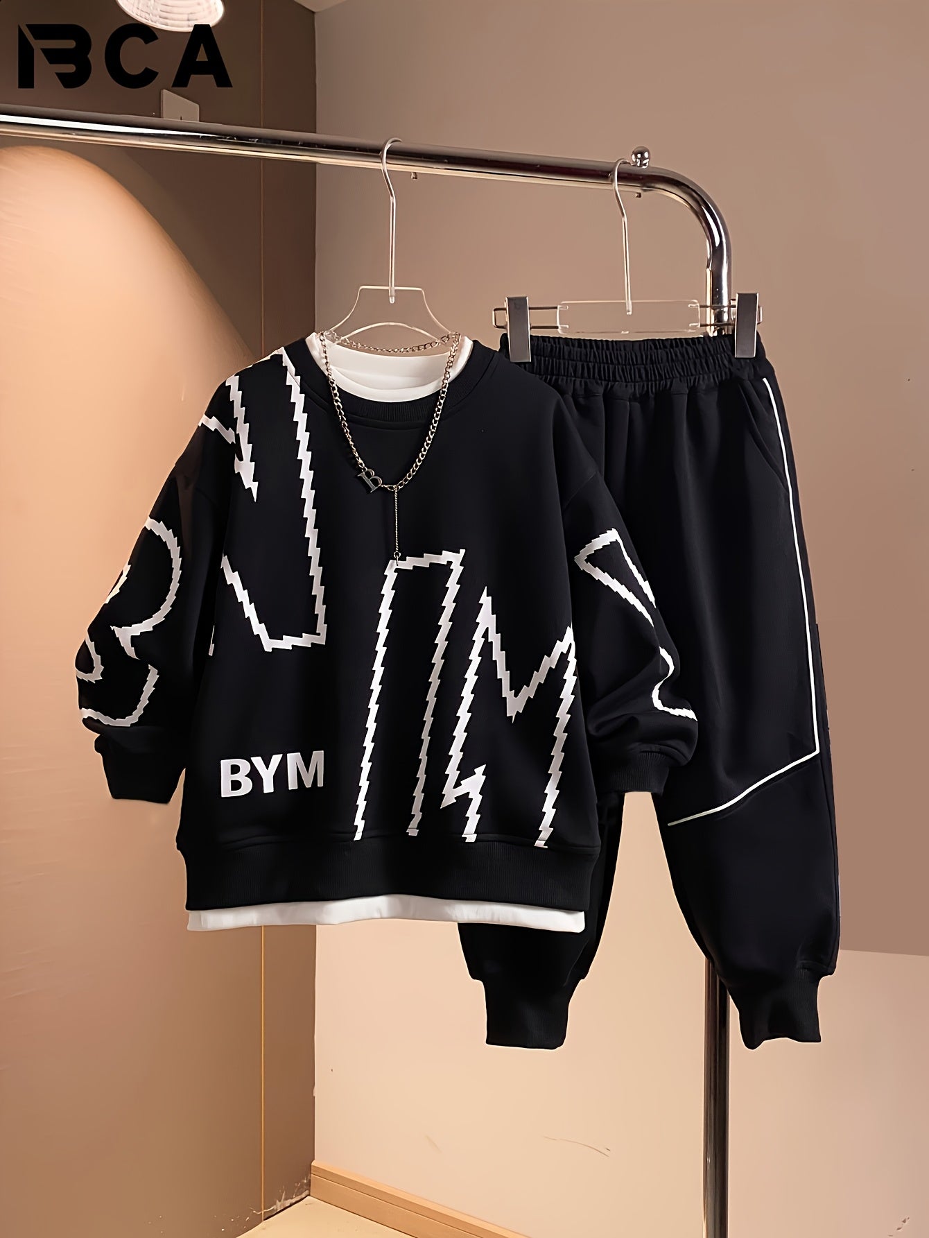 1. Eye-Catching Graphic Design Bold pixel-inspired "BYM" and geometric lightning prints on the hoodie + contrast white side stripes on the pants create an edgy, high-energy street style. Modern monochrome (black/white) palette pairs easily with sneakers and accessories for a standout look.