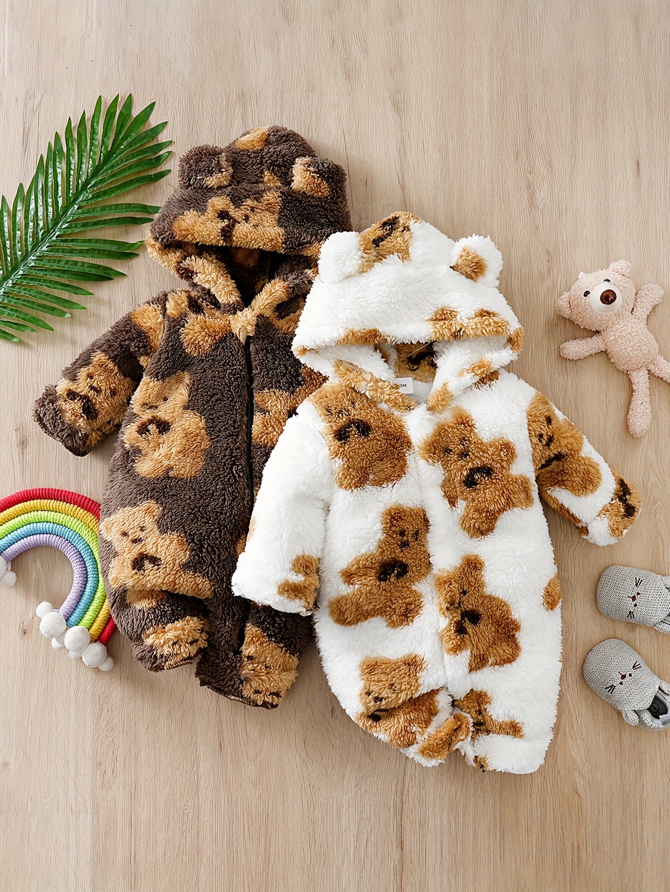 2-Pack Winter Baby Boy Romper, Cartoon Bear Print, Double-Sided Fleece, Warm Hooded Zipper Long Sleeve Onesie, Casual Style, Polyester Knit Fabric, Regular Fit - Fall/Winter Collection, for Outdoor