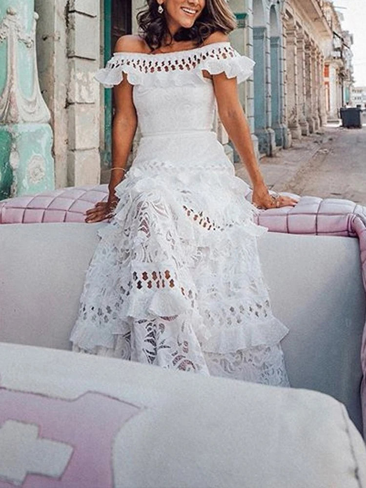 Black Long Dress Elegant One-Shoulder Solid Ruffle Long Evening Dress Summer Elegant Sleeveless Lace Hollow Party Sexy Dress