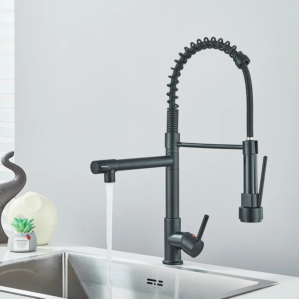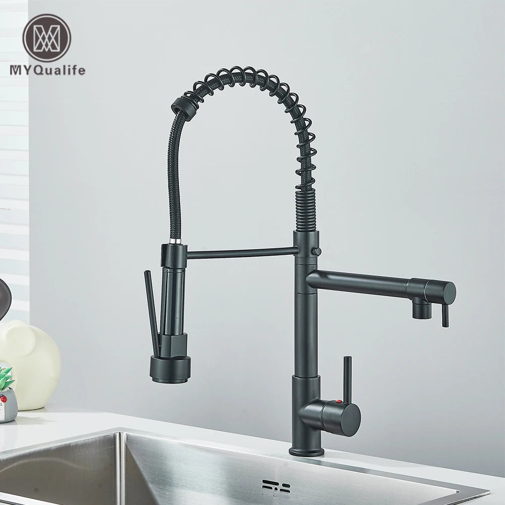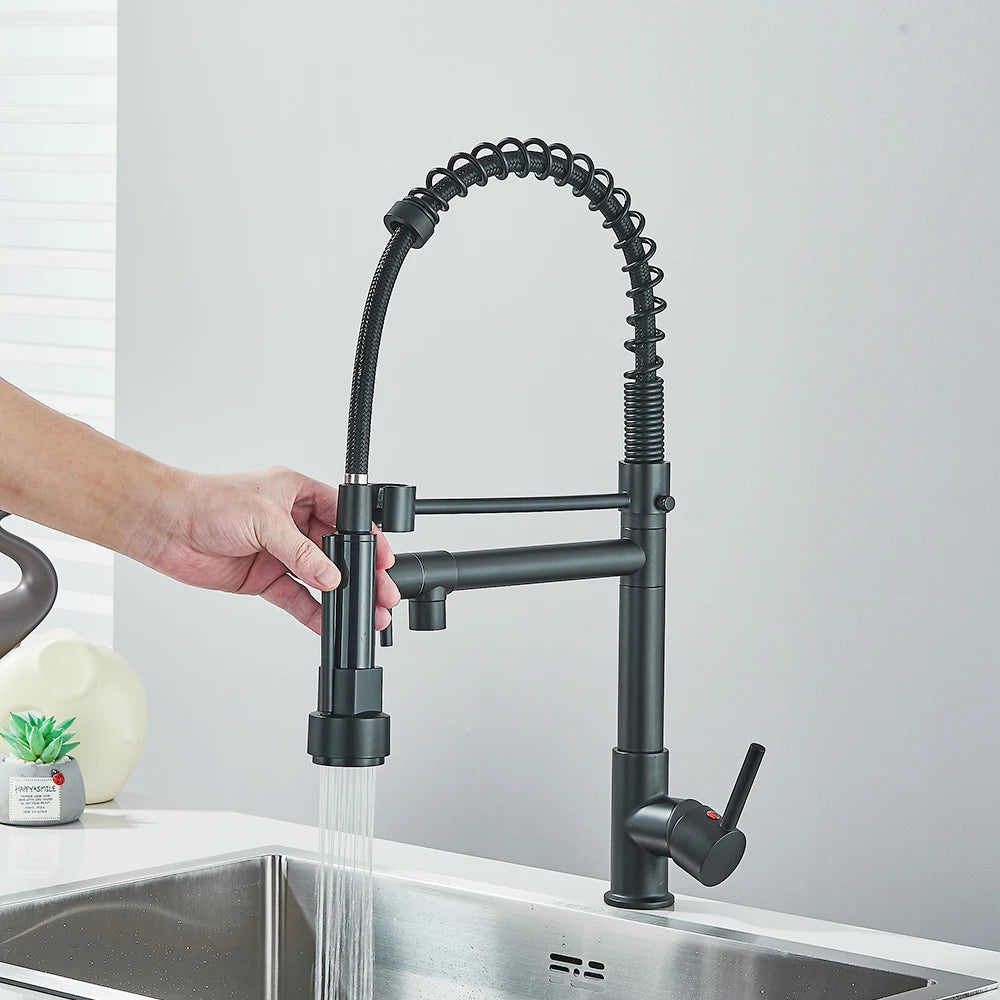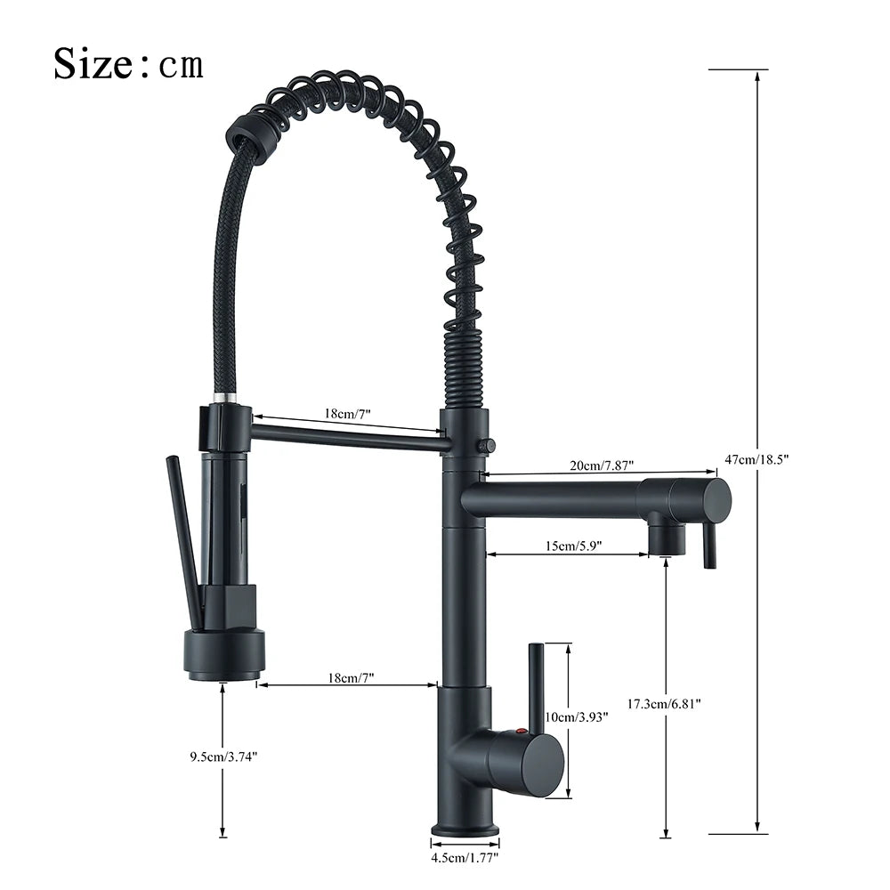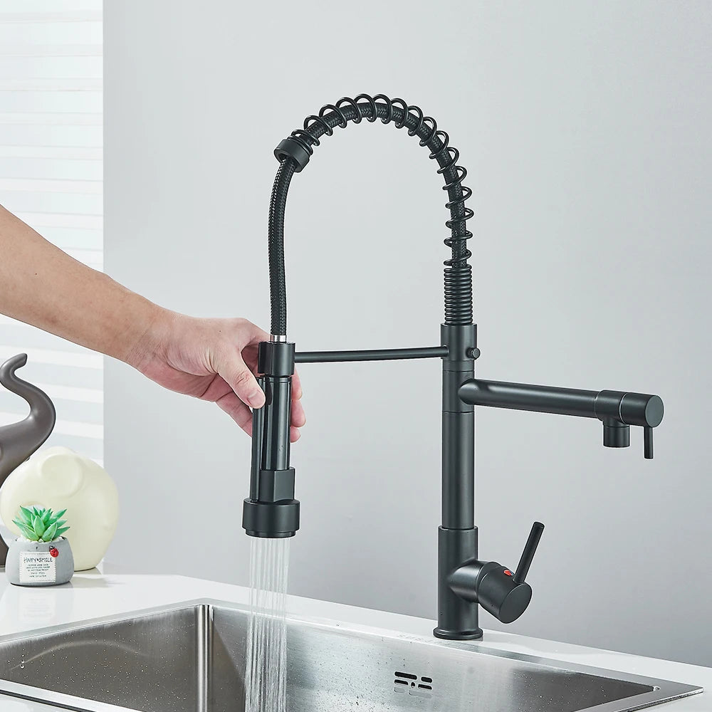 Black Pull Down Kitchen Sink Faucet Hot Cold Water Mixer Crane Tap with Dual Spout 360 Rotation High Faucet Deck Mounted