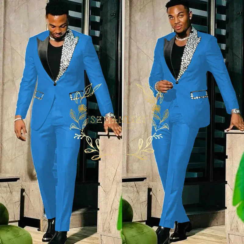 Black Suits for Men Slim Fit Single Breasted Peak Lapel Blazer High Quality Crystal Prom Party 2 Piece Jacket Pants Sets Terno
