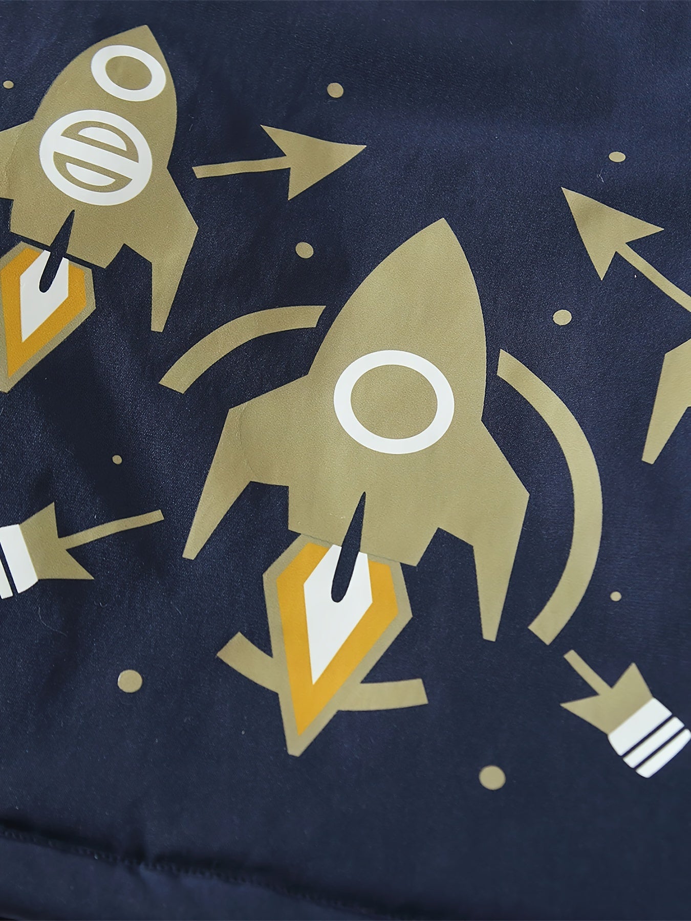 Boys' Casual Fleece Parka with Hood, Long Sleeve, Zippered Closure, Color Block Pattern, Rocket Print, Polyester 100% - Loose Fit, Woven, Non-Stretch, All-Season Warmth