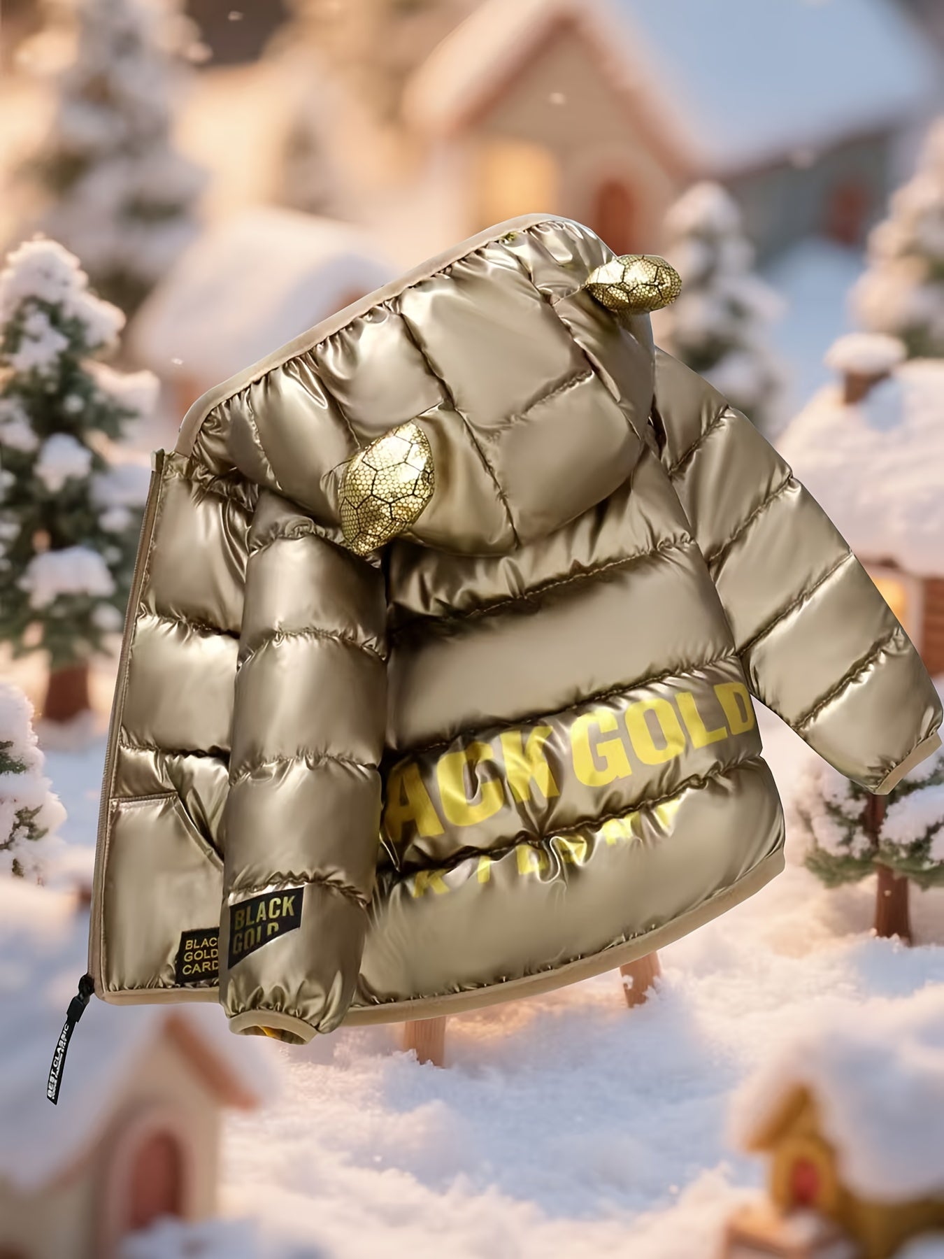 Boys' & Girls' Winter Coat - Warm Zip-Up Hooded Jacket with "ACMGOLO" Print, Golden & Black Design, Long Sleeves, Polyester Filling, Casual Style for All Seasons, Winter Coat for Boys, Allseason Outerwear, Stylish Winter Wear, Durable Winter Wear