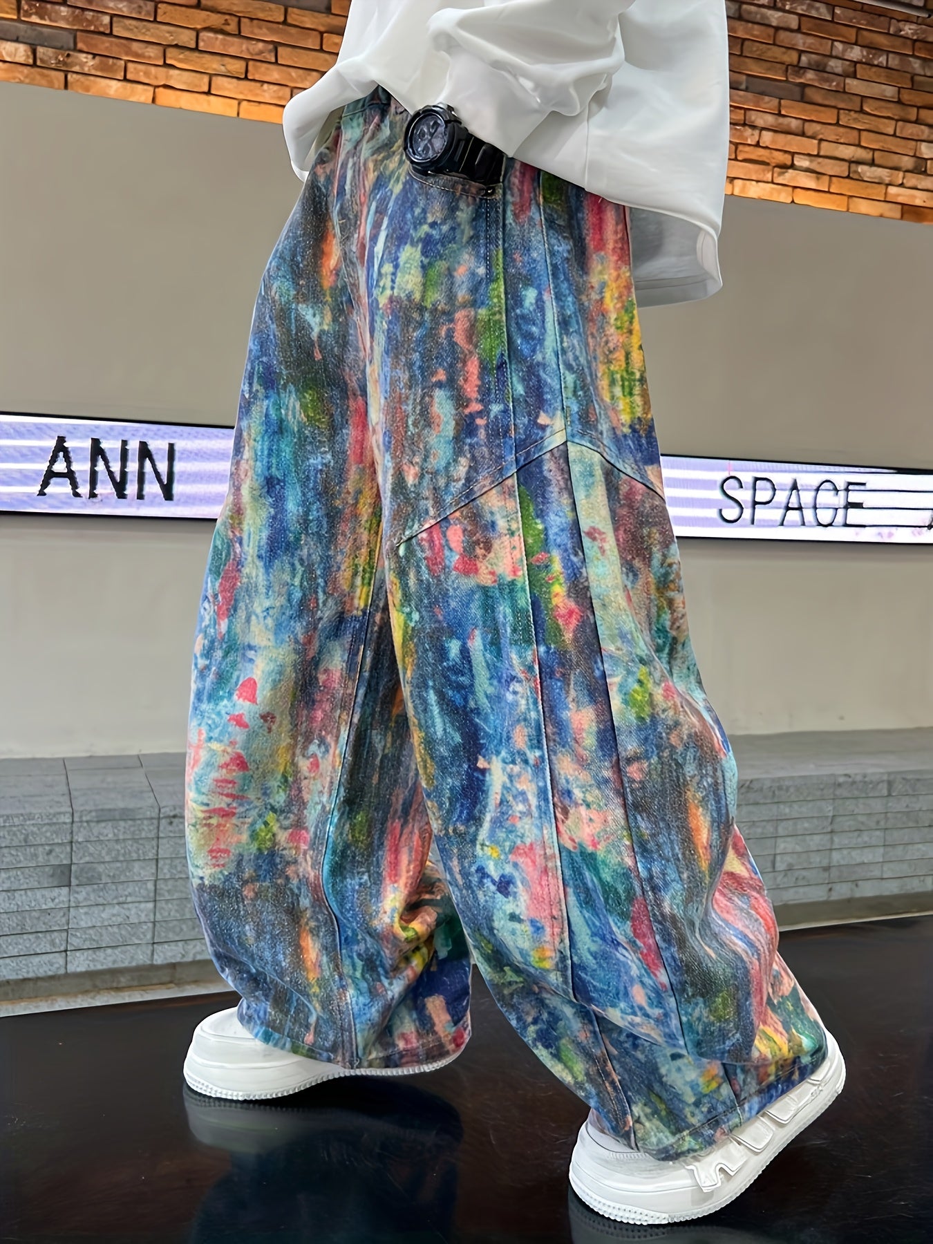 Boys' Streetwear Wide-Leg Pants - Vibrant Tie-Dye Pattern, Elastic Waistband with Drawstring, Pockets, Regular Fit Casual Trousers for Spring/Fall Outdoor Play & Casual Attire, Boy Pants, Spring Fall Attire, Trendy Streetwear, Comfortable Fit, for Outdoo