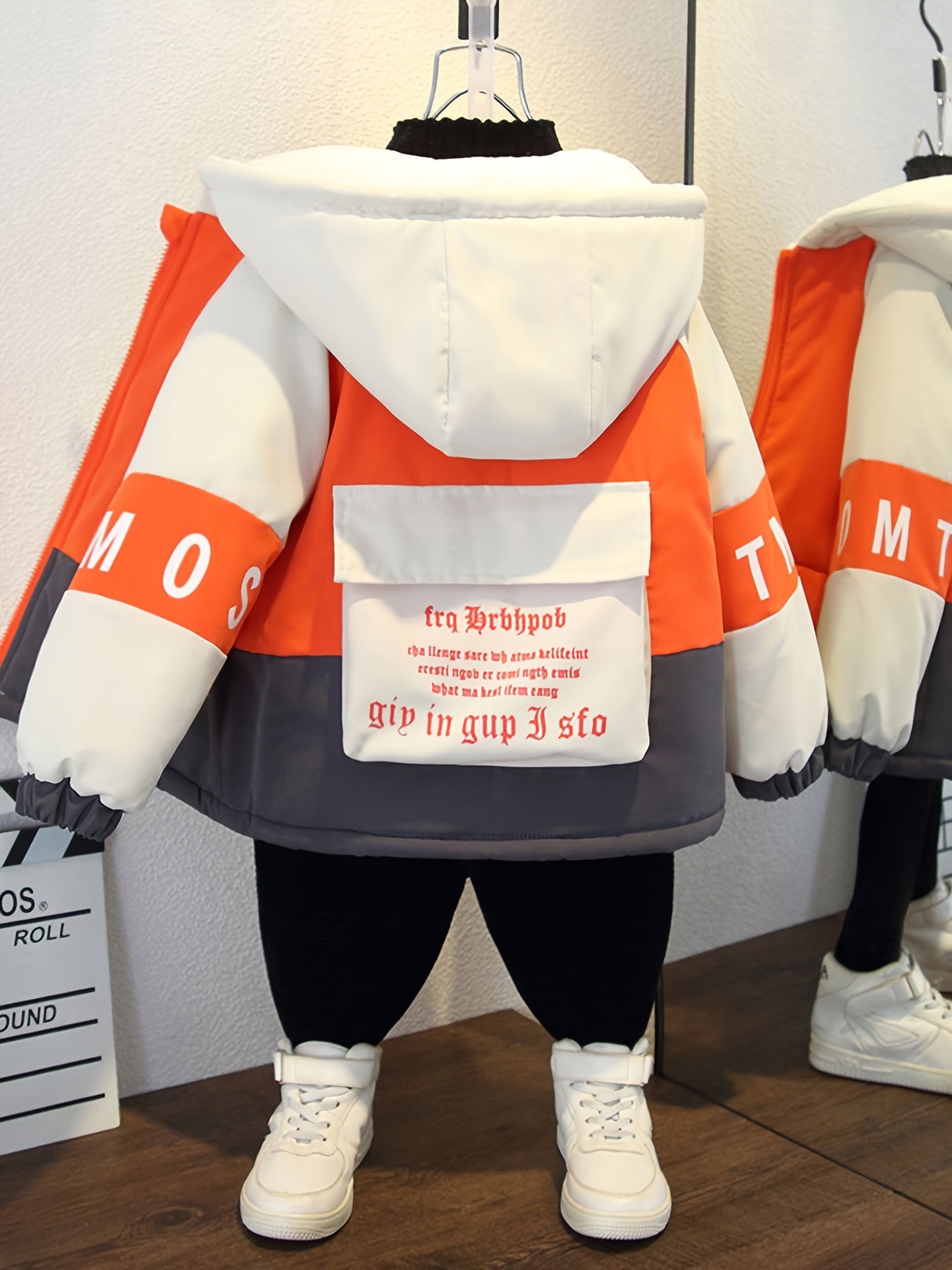Boys Warm And Cozy Letter Print Hooded Jacket - Thick Fleece Coat With Pocket For Winter Outdoor - Polyester Material, Regular Fit, Long Sleeve, Casual Style