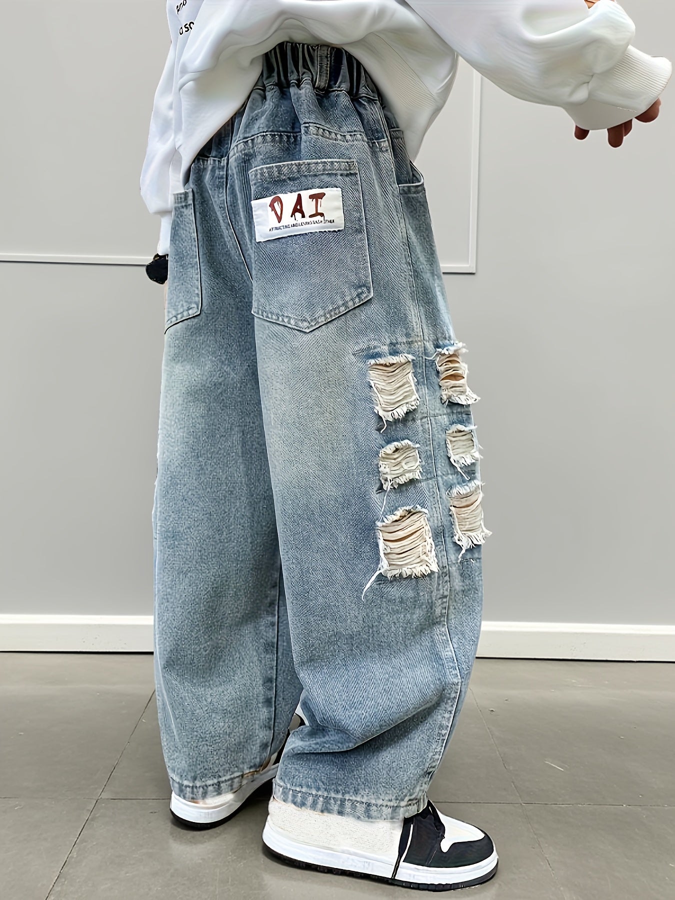 Boys' -Wash Blue Distressed Denim Jeans - Heavyweight 100% Casual Pants with Frayed Hem & Ripped Knee Design, Spring/Fall Season Comfortable Casual Attire for Teen Boys (Hand Washable) - Ideal for Layering & Casual Outfits, Relaxed Fit with Classic Five-