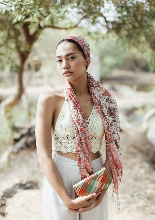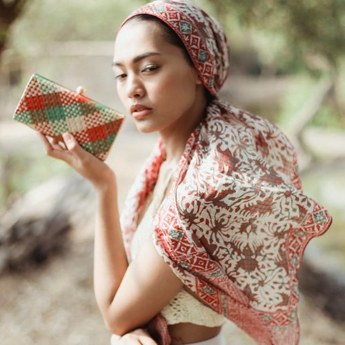 Soft and silky scarf hand-weaved by local artisans in Bali. The flower patterns are hand-stamped using traditional Indonesian Batik wax technique, resulting in unique and detailed motif that turns head every time you wear it. Tie it around your neck, in your hair, or simply tie it on the handle of your tote to add a chic tropical feel to any look.