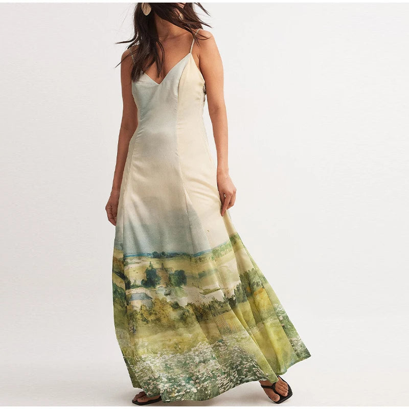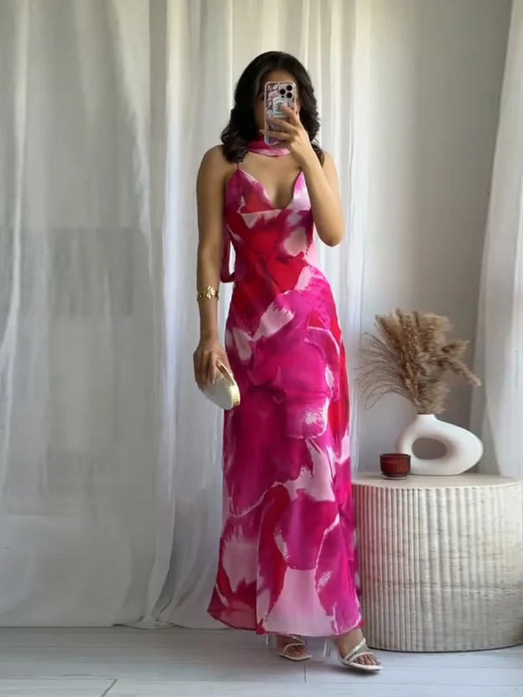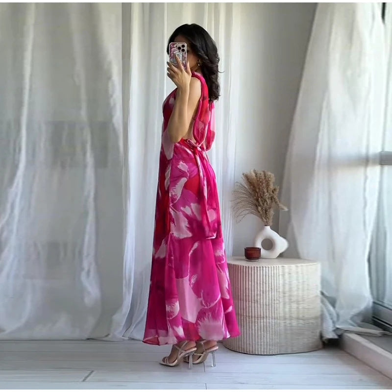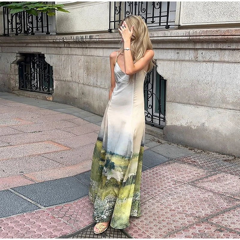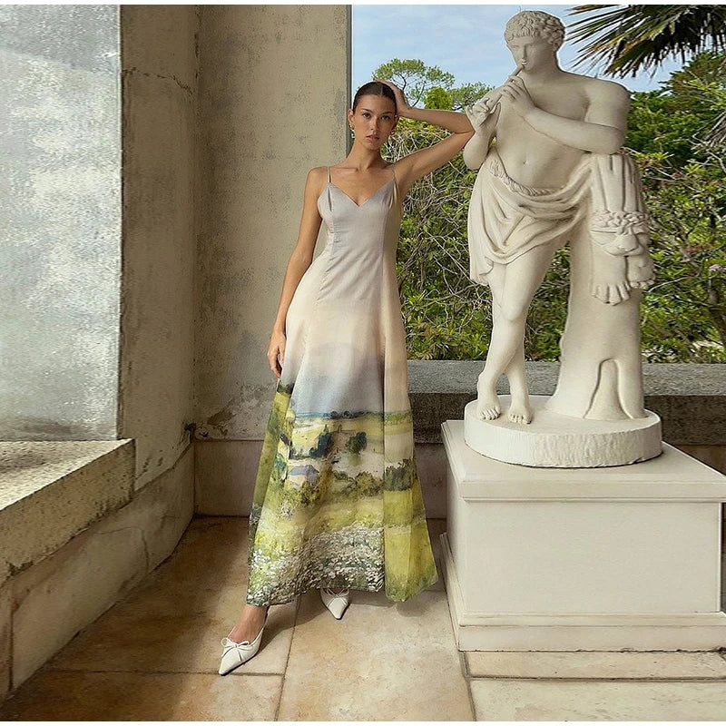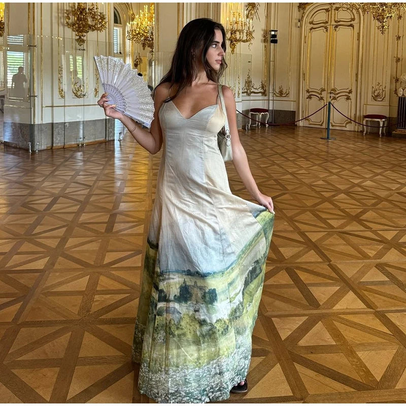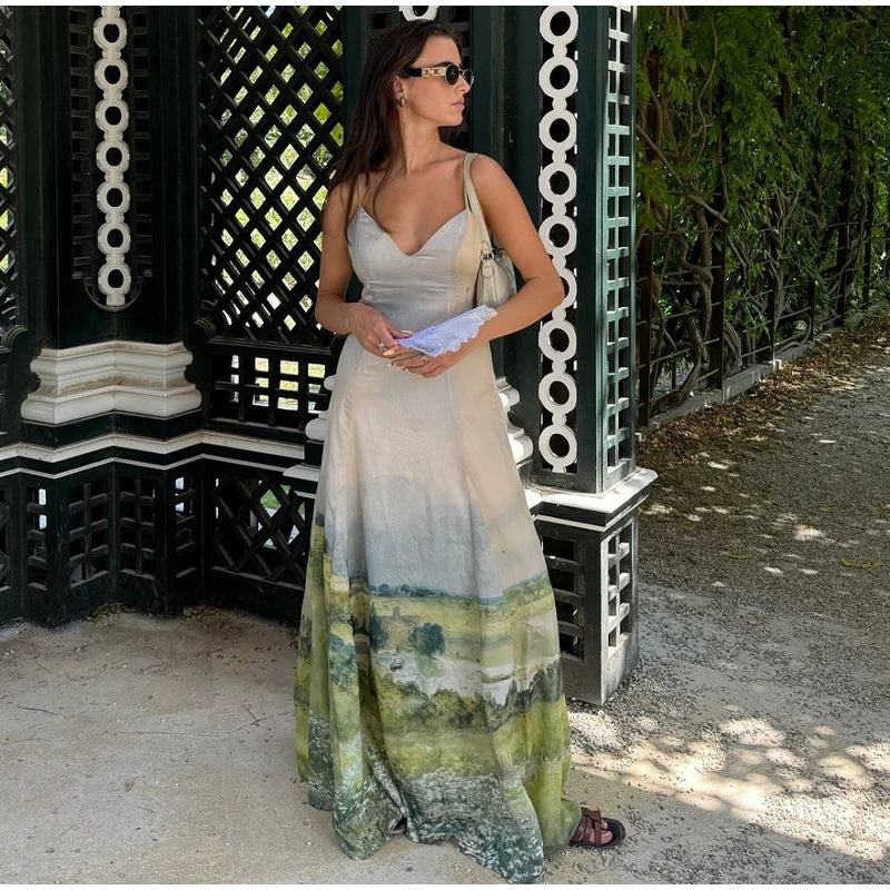 Elegant Printed Tighte Waist Women's Long Dress V-neck Slim A-line Robe 2025 Summer Beach Holiday Style Female's Long Dresses