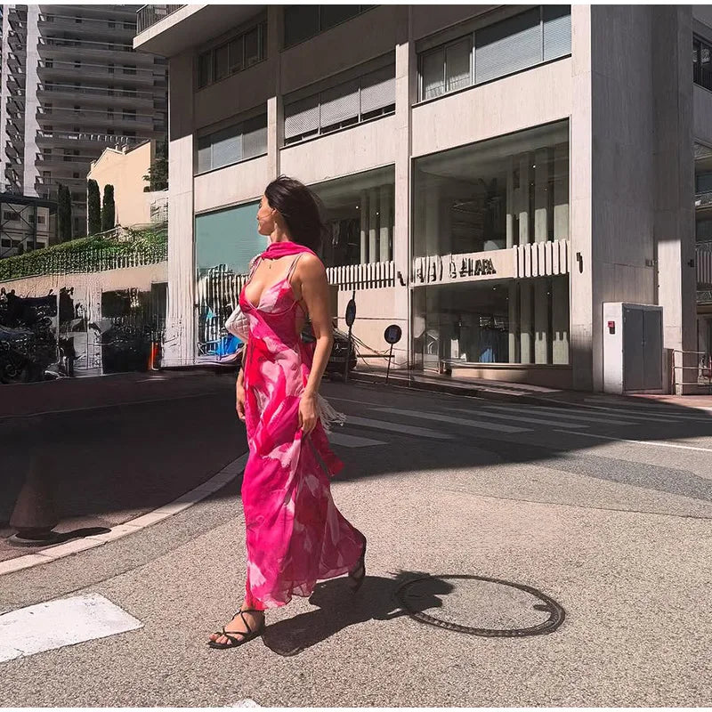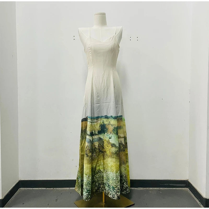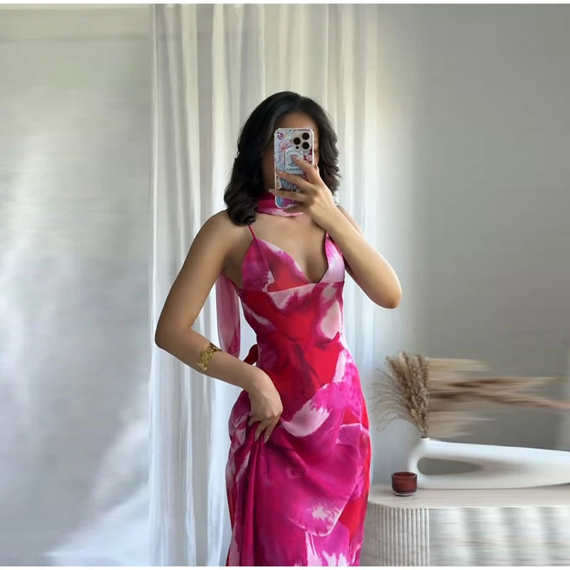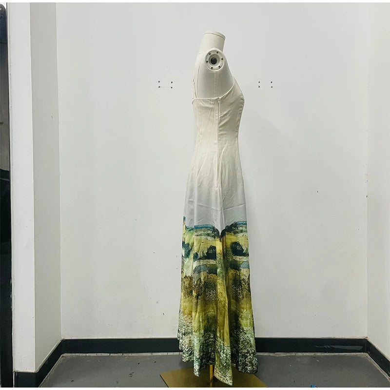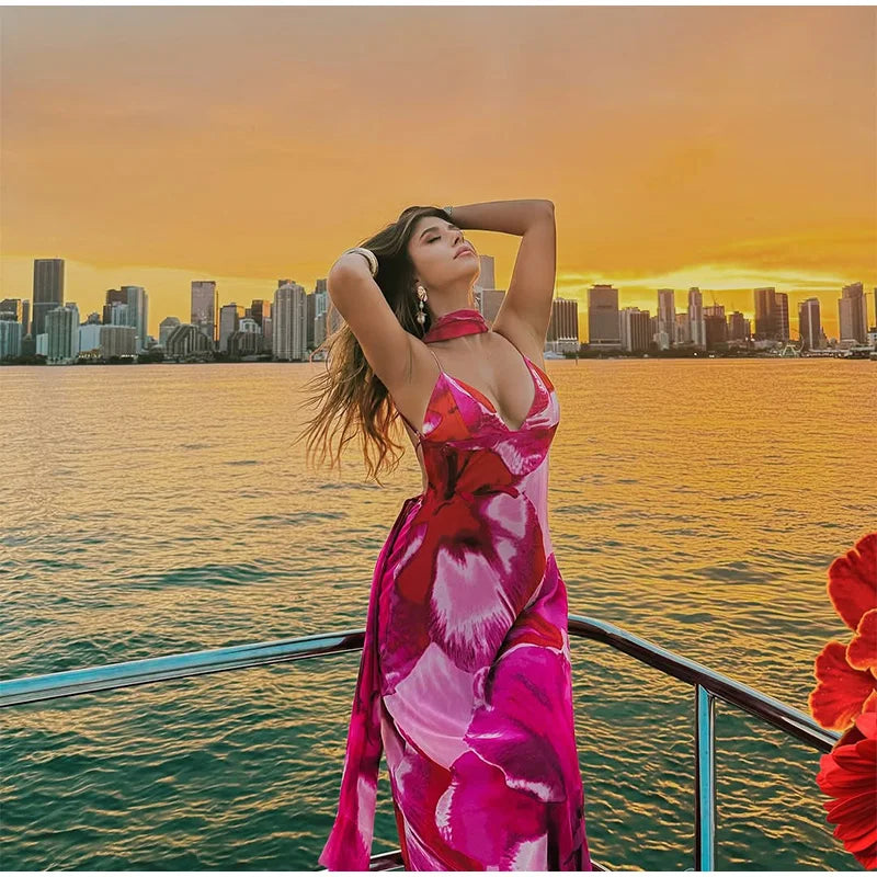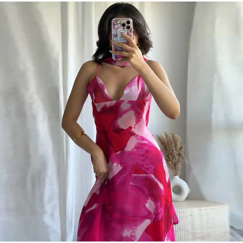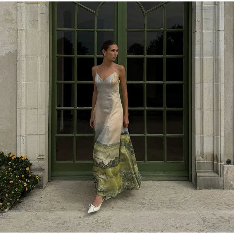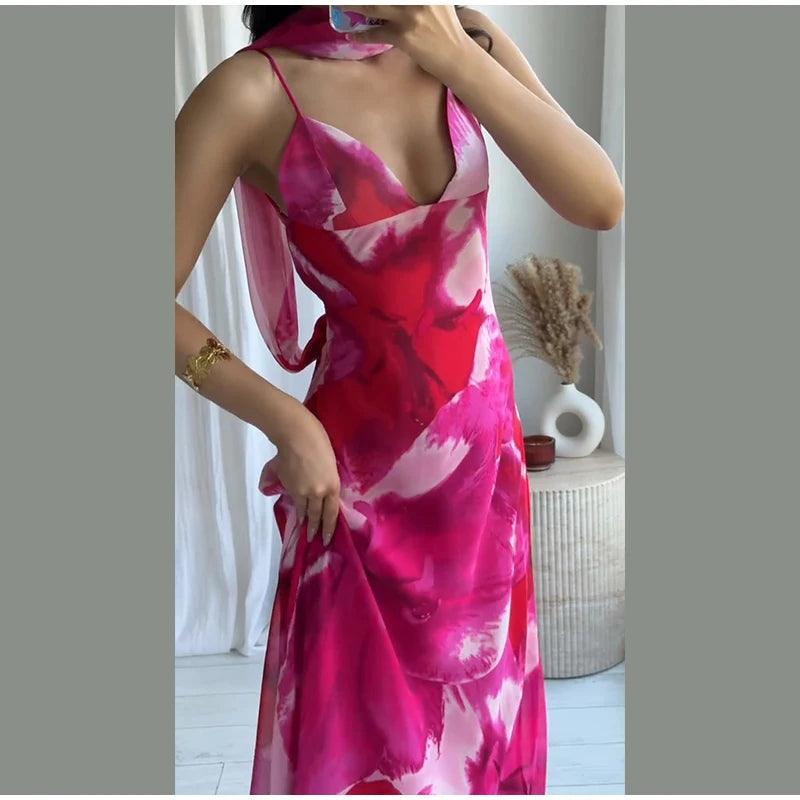 Elegant Printed Tighte Waist Women's Long Dress V-neck Slim A-line Robe 2025 Summer Beach Holiday Style Female's Long Dresses
