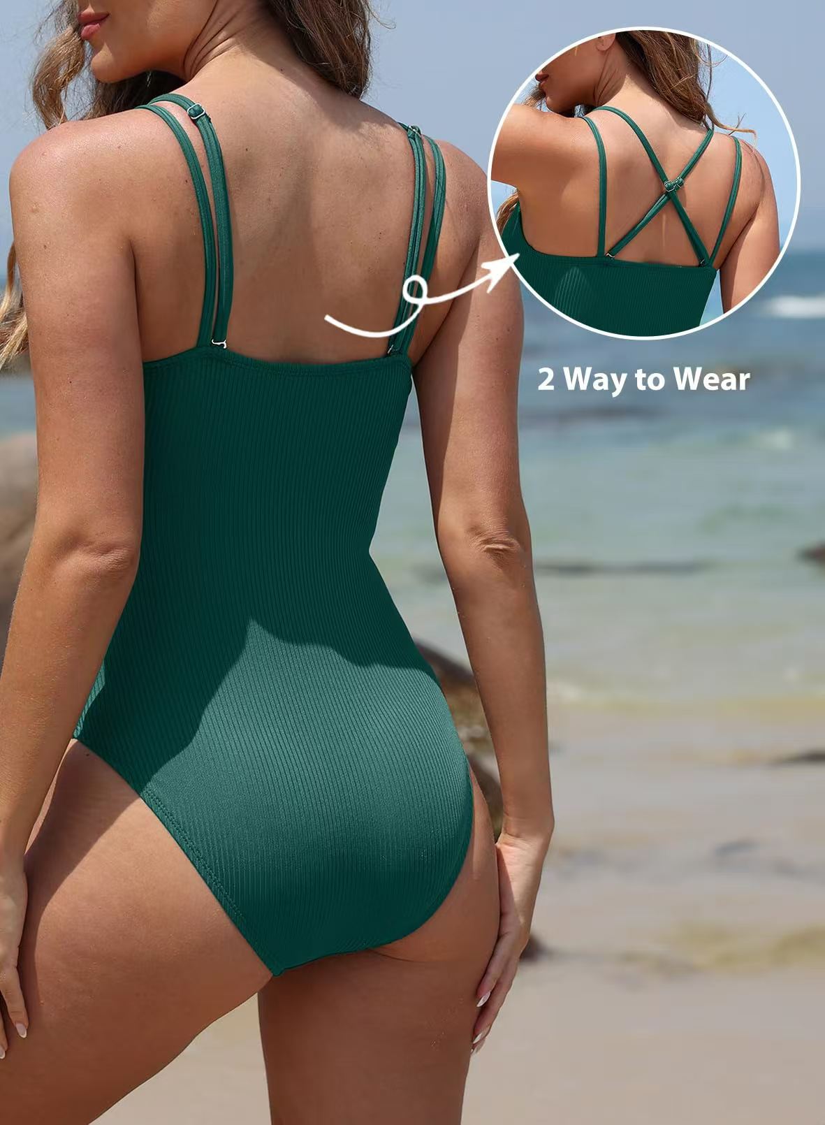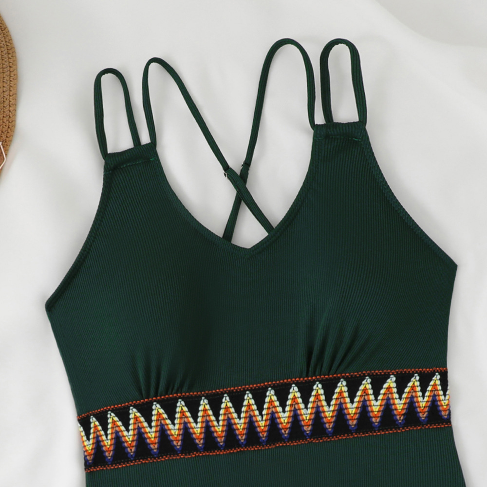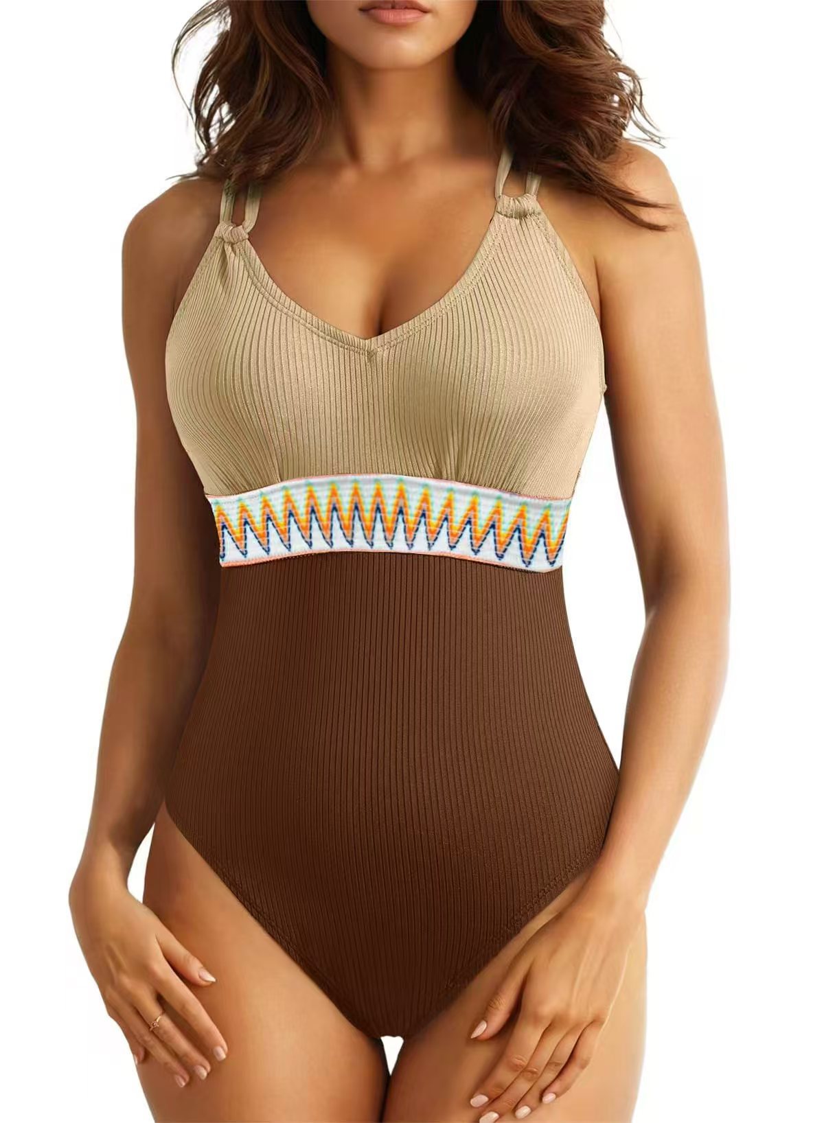 European And American One-piece Panel Stitching Rib Fabric Solid Color Women's Swimsuit