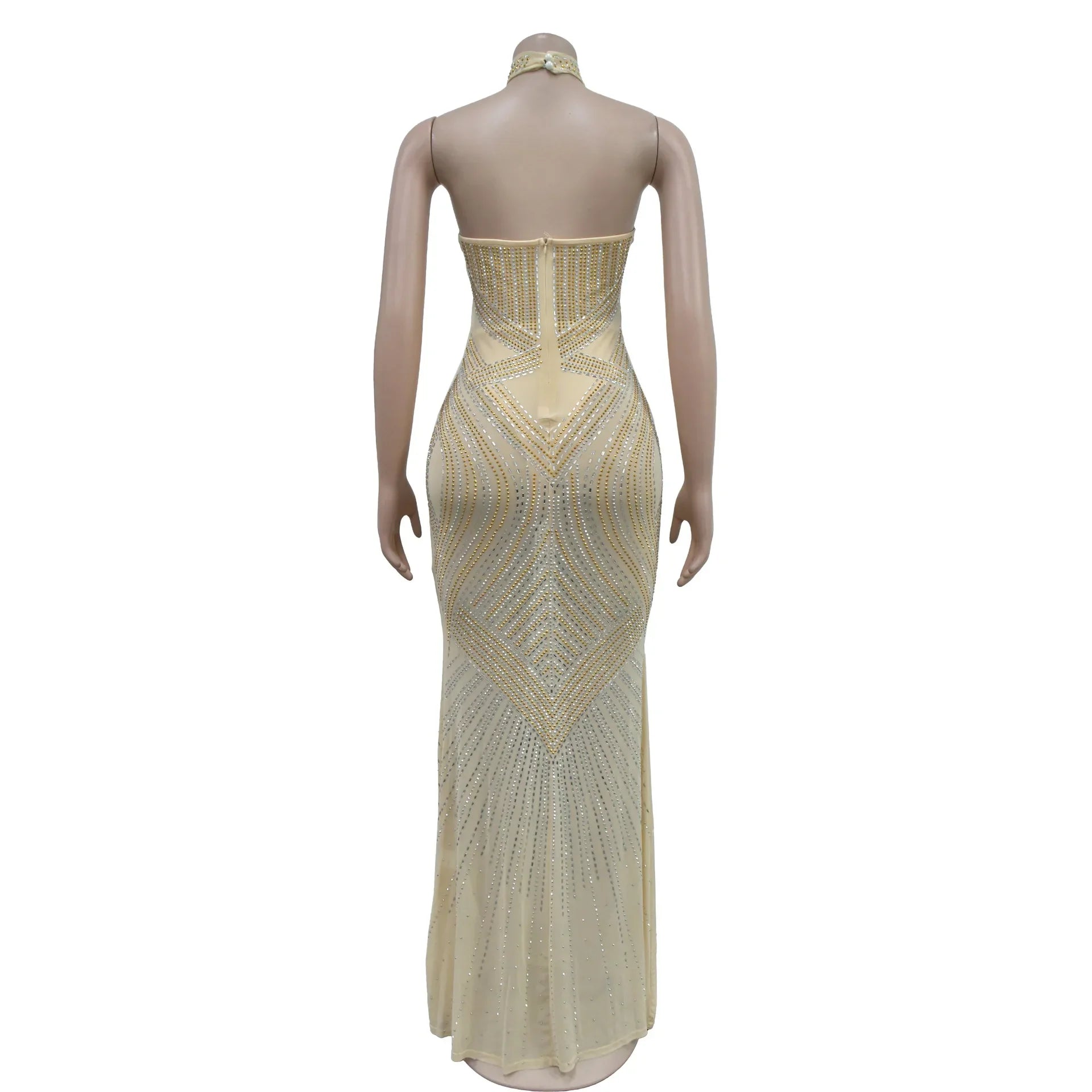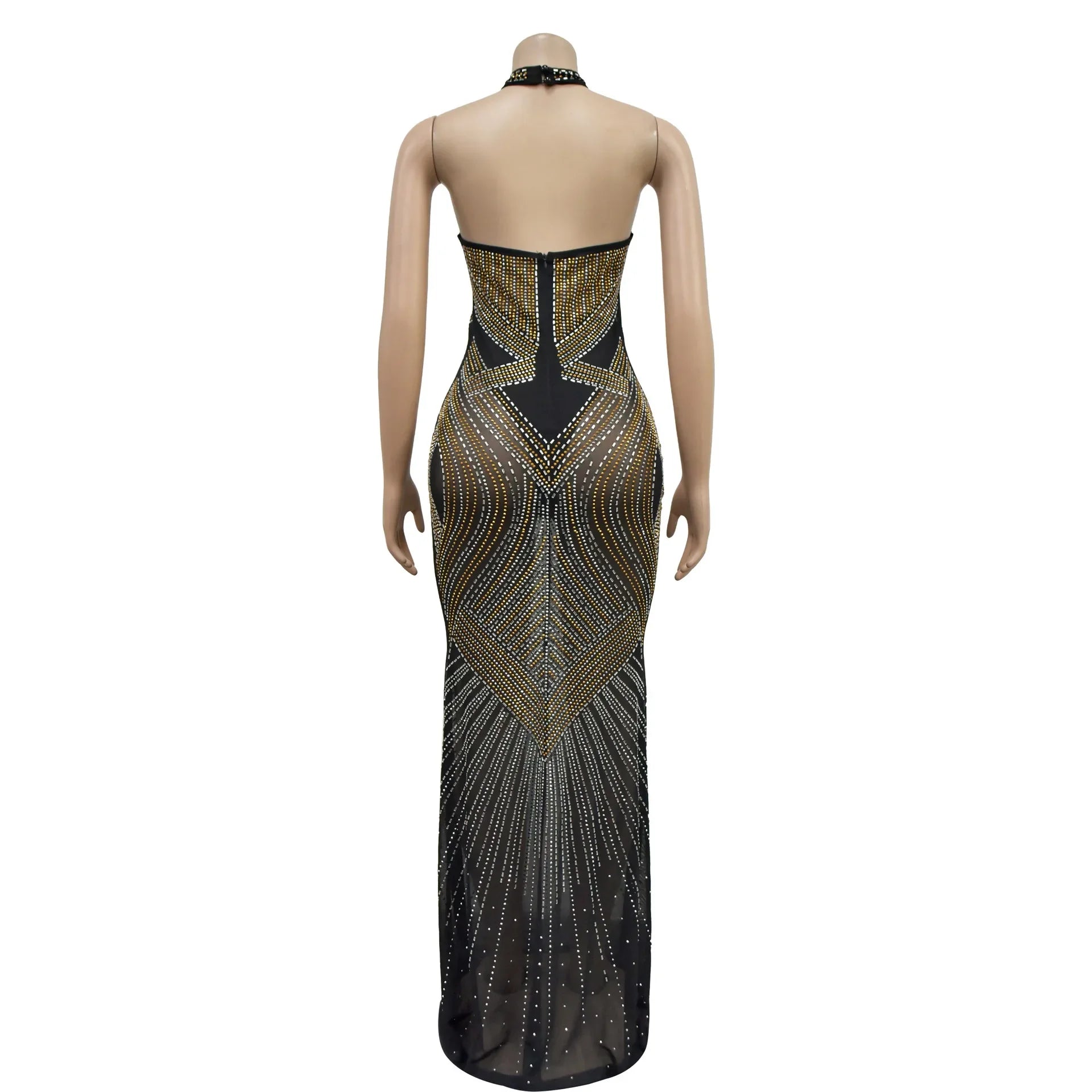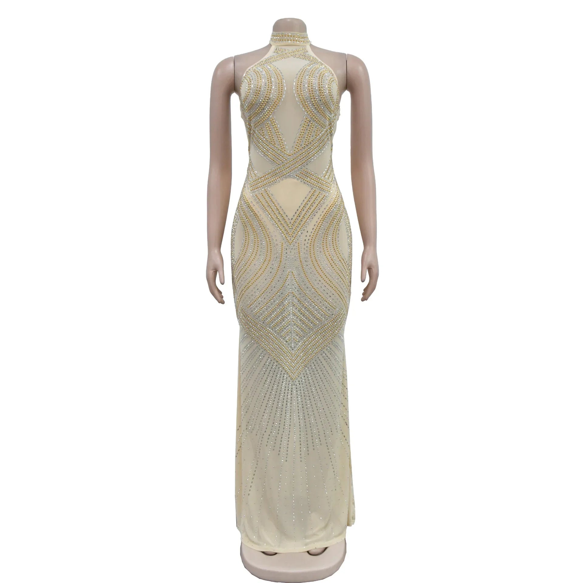 Fashion Women's Wear Solid Color Mesh Hot Rhinestone Halter Maxi Dress Sleeveless Formal Evening Long Dress Skinny Slim