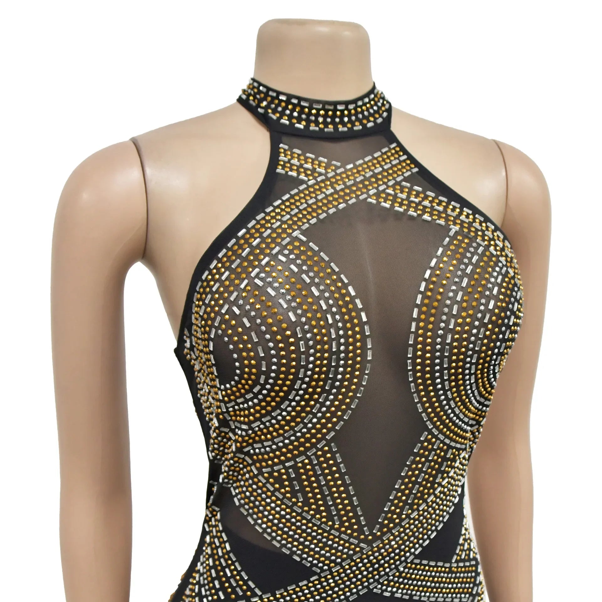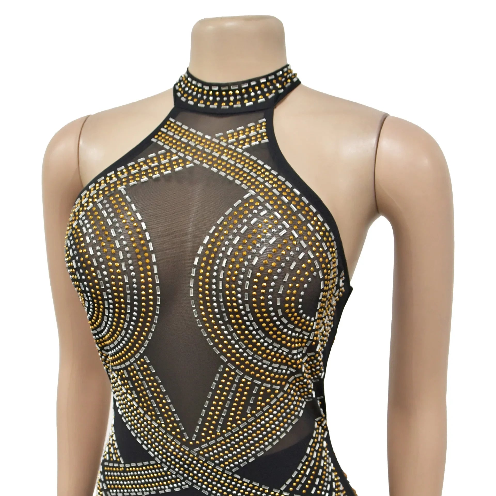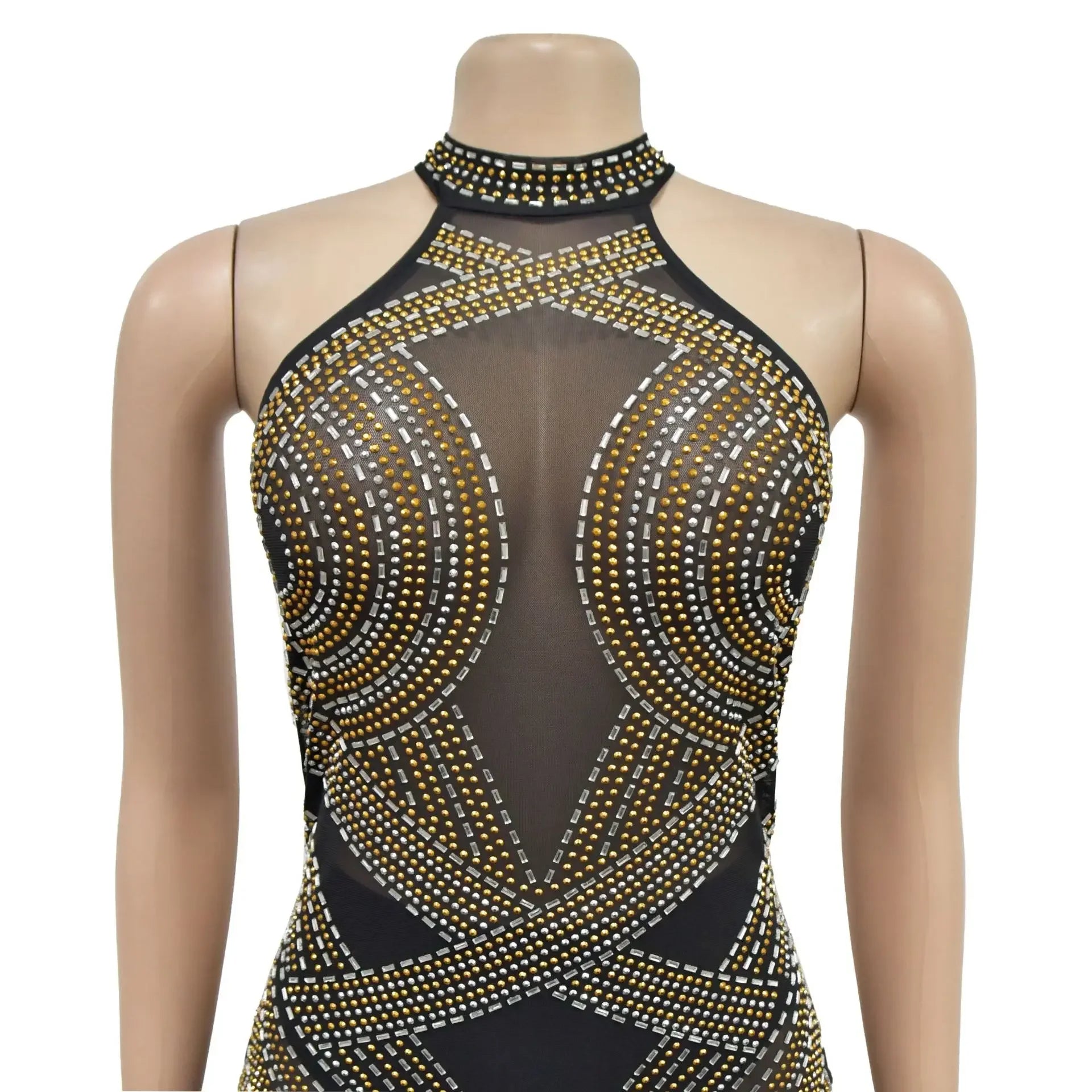 Fashion Women's Wear Solid Color Mesh Hot Rhinestone Halter Maxi Dress Sleeveless Formal Evening Long Dress Skinny Slim