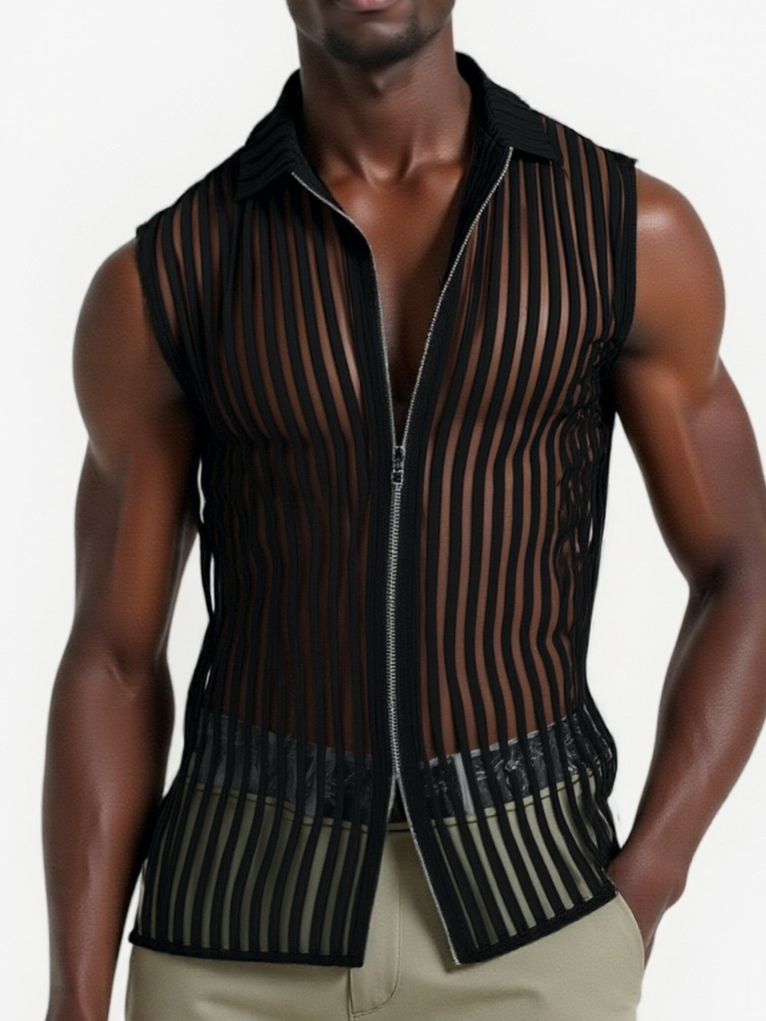 INCERUN Men's Sheer Striped Zip-Up Tank Top - Sexy Mesh Beach & Party Vest, Breathable Polyester-Spandex Blend, Machine Washable