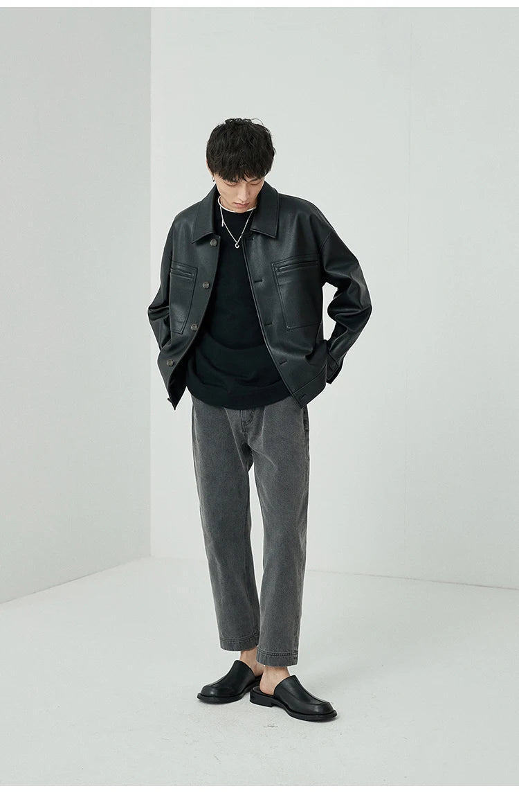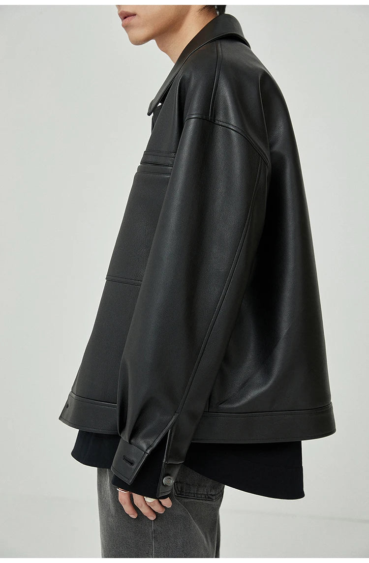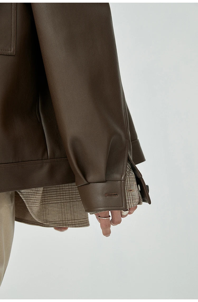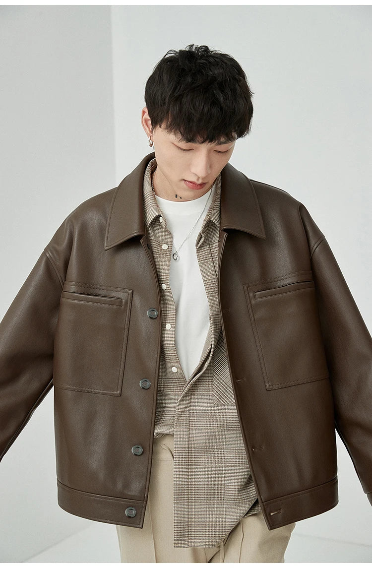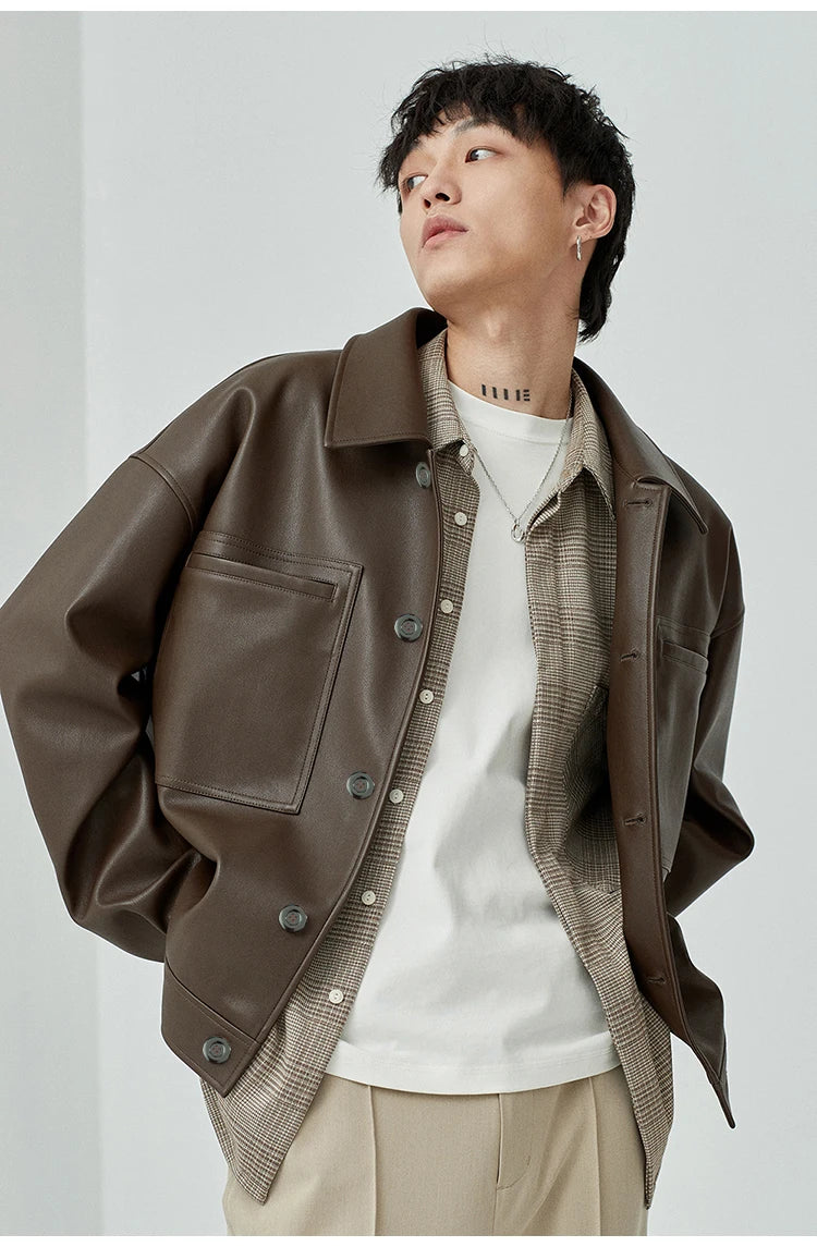 Mauroicardi Spring Autumn Short Oversized Brown Black Soft Faux Leather Jackets for Men Pockets Long Sleeve Korean Fashion 2022