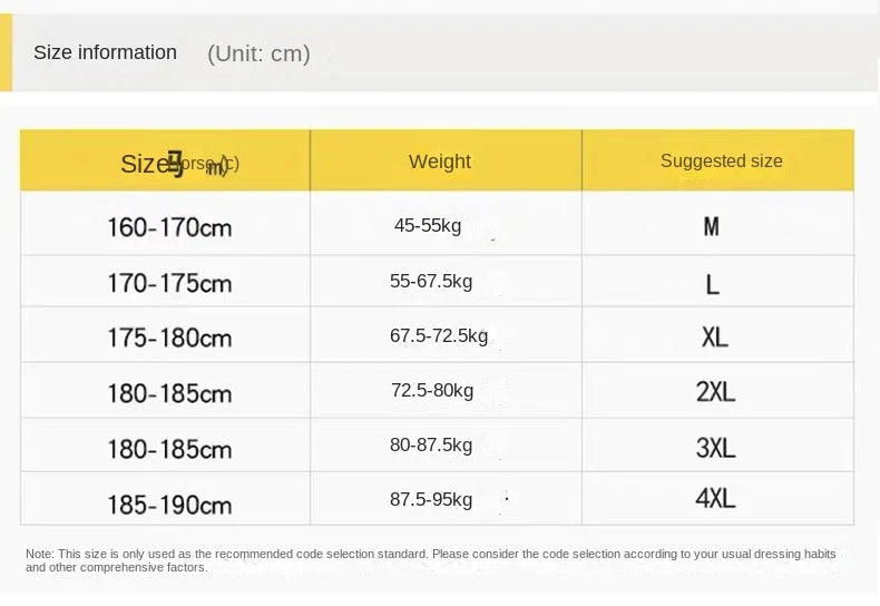 size_info: {"sizeInfoList":[{"length":{"cm":"160-170","inch":"62.99-66.93"},"size":"M","vid":-1},{"length":{"cm":"170-175","inch":"66.93-68.90"},"size":"L","vid":-2},{"length":{"cm":"175-180","inch":"68.90-70.87"},"size":"XL","vid":-3},{"length":{"cm":"180-185","inch":"70.87-72.83"},"size":"XXL","vid":-4},{"length":{"cm":"180-185","inch":"70.87-72.83"},"size":"XXXL","vid":-5},{"length":{"cm":"185-190","inch":"72.83-74.80"},"size":"4XL","vid":-6}]}