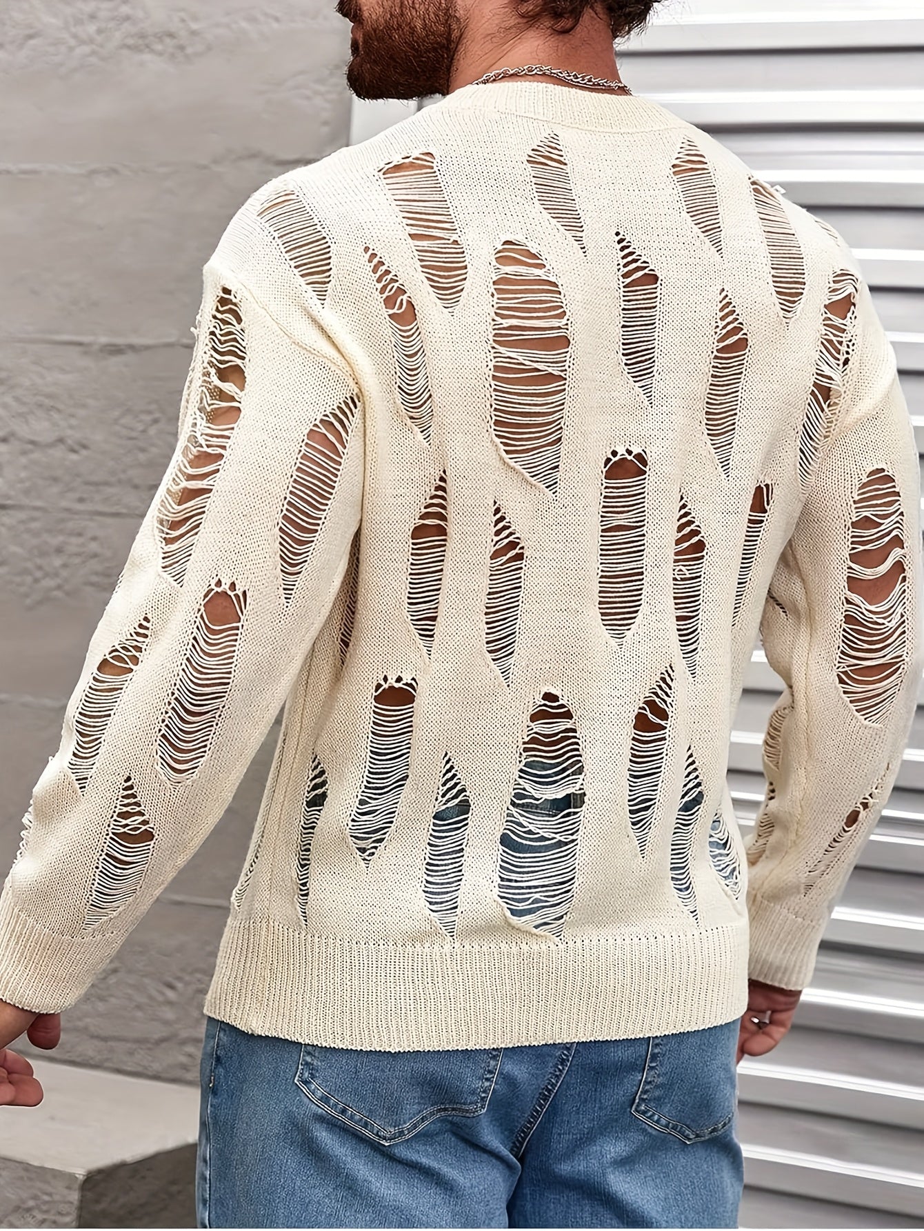 Men'S Chic Black Distressed Knit Sweater - Sexy Cropped Design, Medium Stretch Fabric, Perfect for Spring/Fall, Casual Wear|Fashionable Ripped Look|Stretchy Fabri