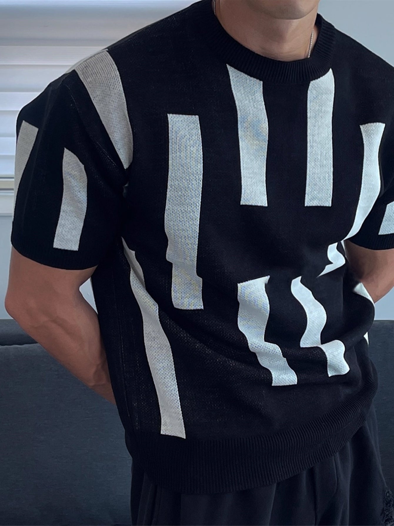 Men'S Color Block Knit Sweater - Black & White Contrast Pullover, Soft Stretchy Knit Fabric, Round Neck Casual Sweater for Spring/Fall Layering, Everyday & Formal Outfits - Easy-Care Modern Sweater for Men, Knit Sweater, Spring Fall Attire, Contrast Colo