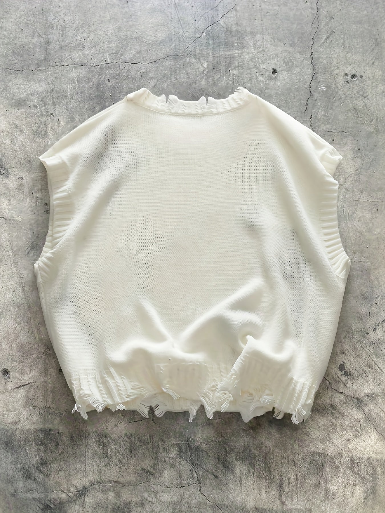 Men's Gothic Distressed Cross Sleeveless Vest - Black & White Frayed Hem Knit-like Short Layering Piece, Oversized Winter Streetwear Top for & Young Men, Edgy Layered Outfit (No Belt, Hand Washable)