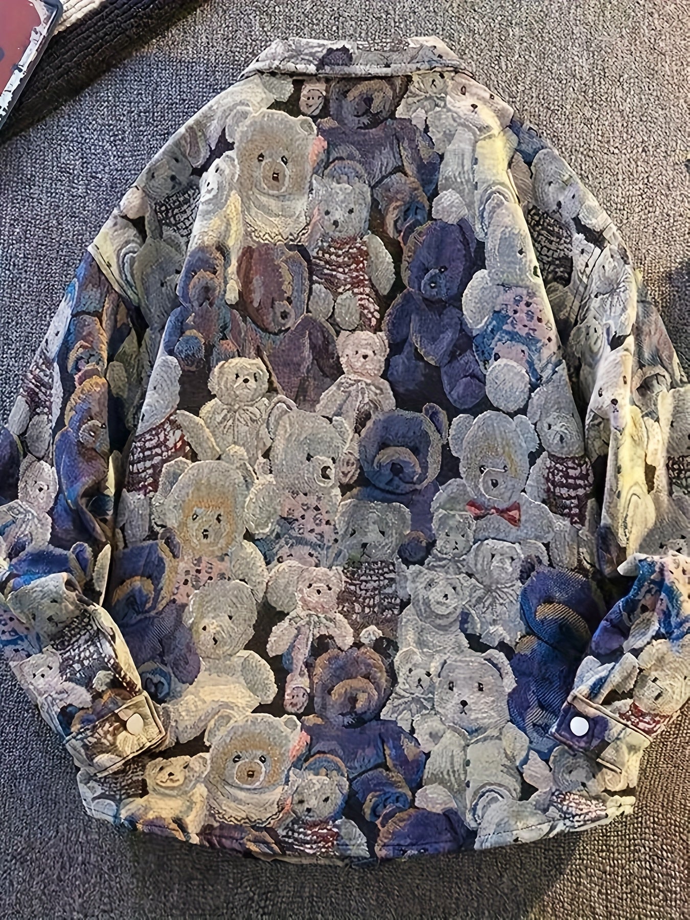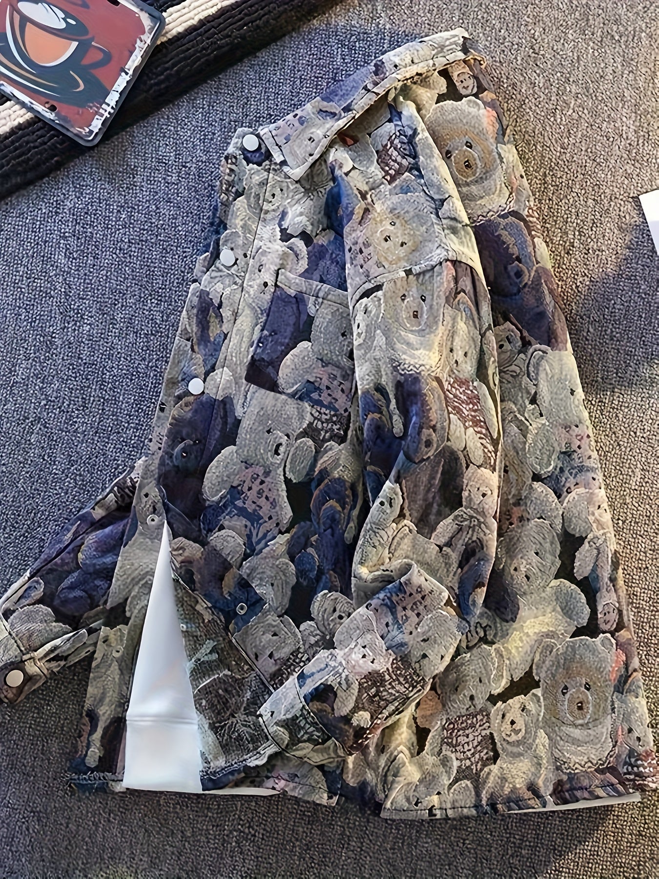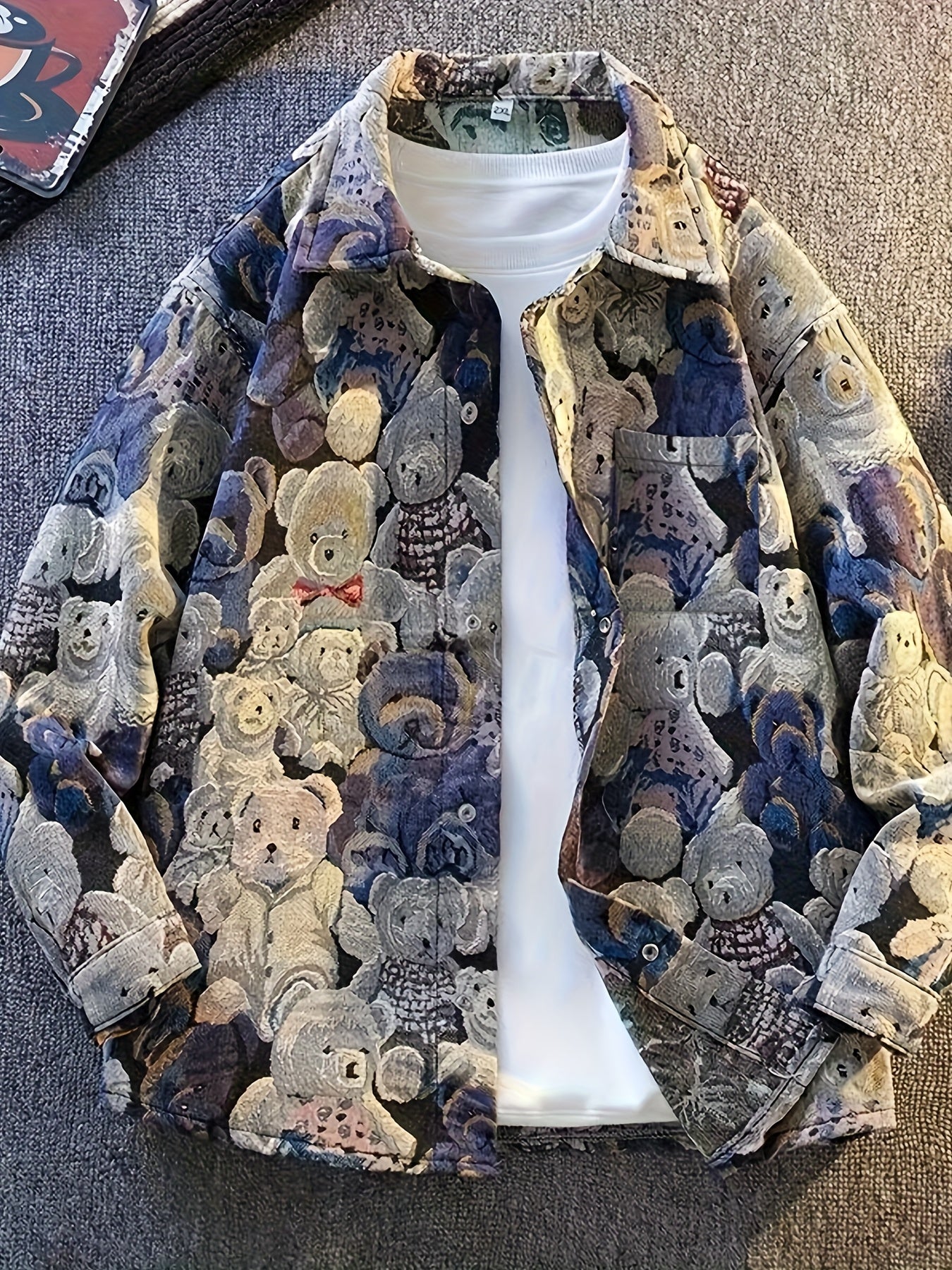 Men'S High-Street Design Bear Print Jacket - Casual Loose Fit American Style with Snap Closure, Pockets & Lapel Collar, Non-Stretch Fabric, Regular Fit for Casual Attire, Bear Jacket, Streetwear Fashion, Trendy Outerwear, Durable Outerwear