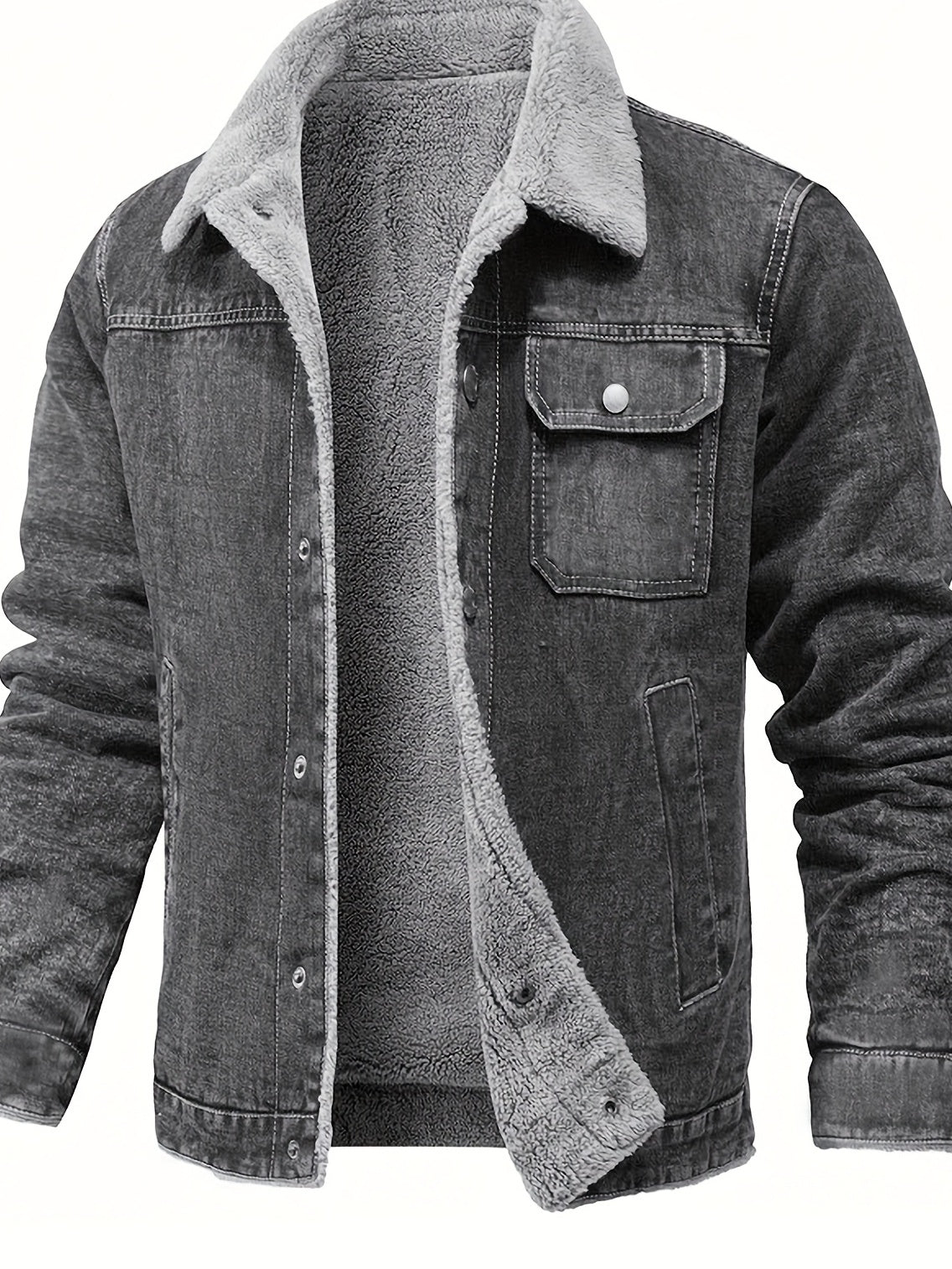 Men's Vintage Washed Denim Jacket with Fleece Lining - Warm, Casual Winter Coat with Buttoned Cuffs and Chest Pockets, Grayish-Black Distressed Look