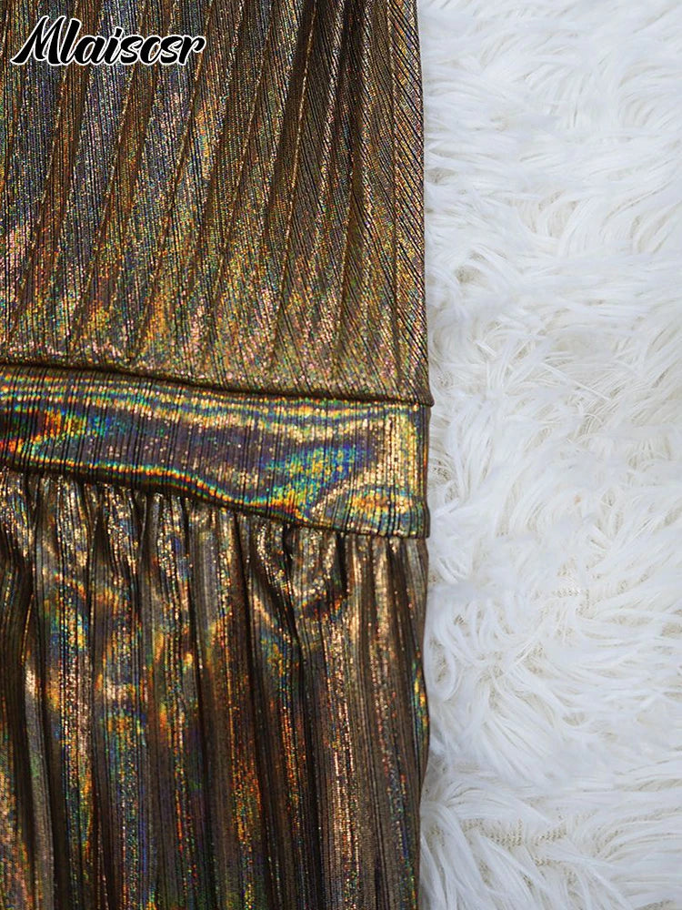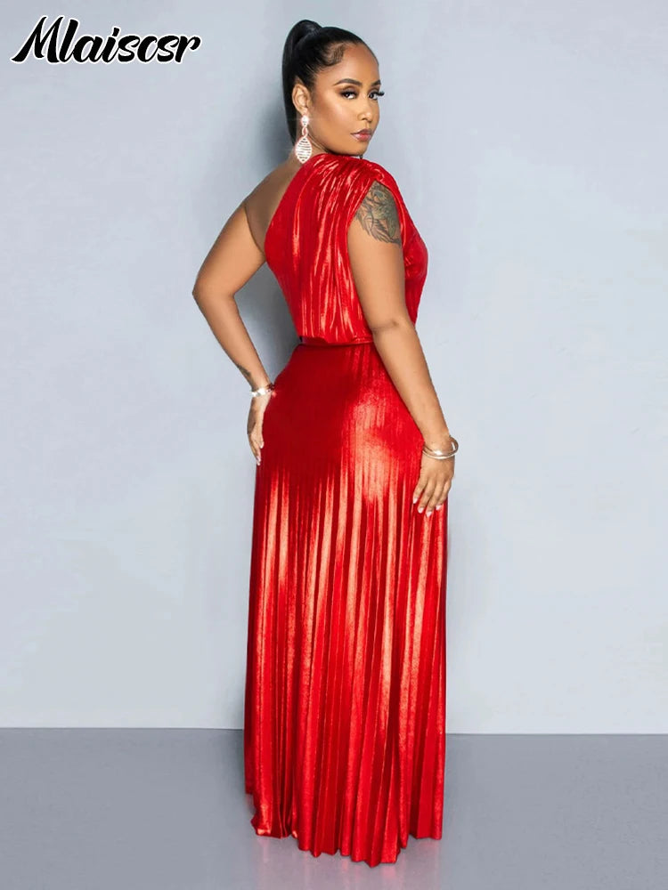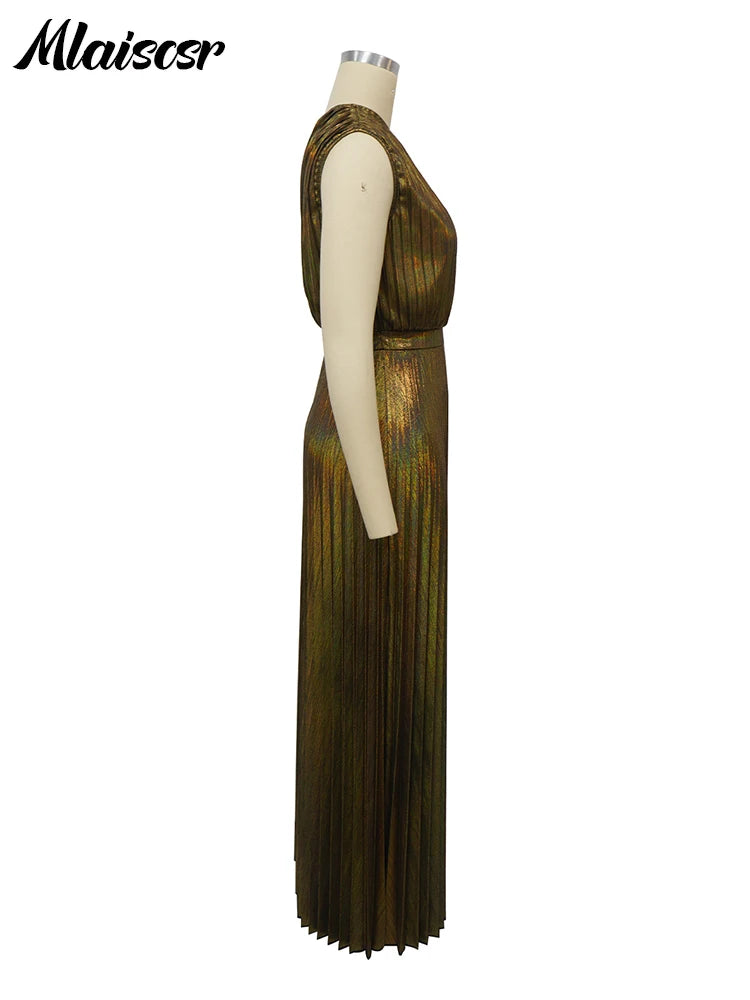 Mlaiscsr Metallic Golden One Shoulder Sleeveless Pleated A-Line Long Dress Elegant Women Luxury Birthday Evening Gowns Vestidos