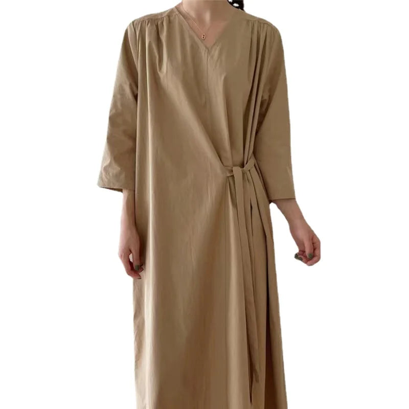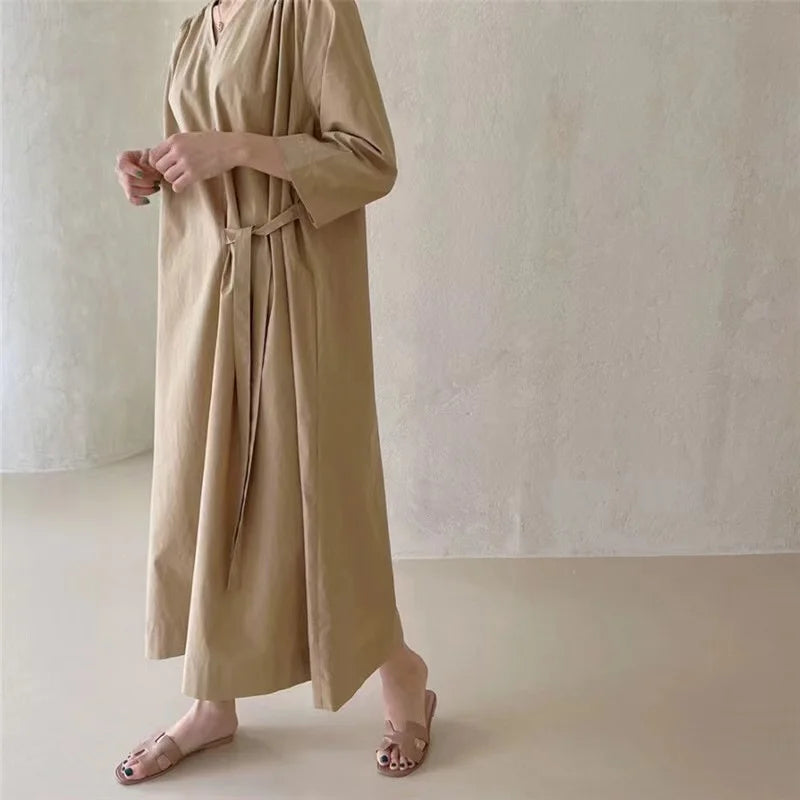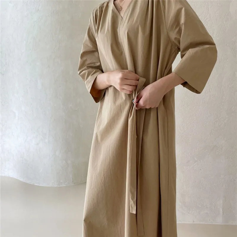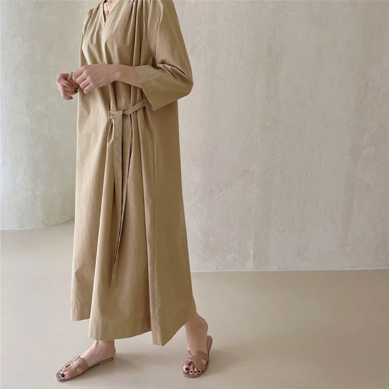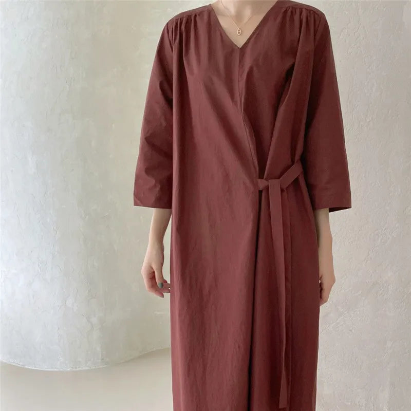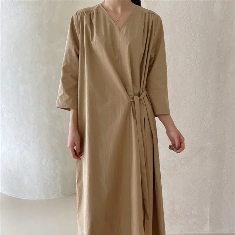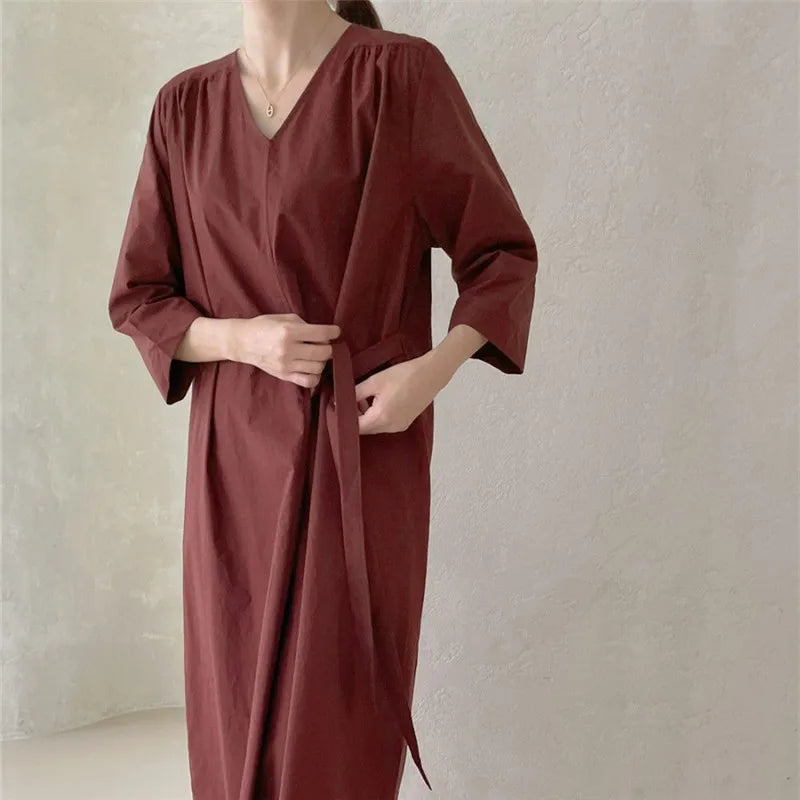 REALEFT 2024 New Summer Korean Vintage Women's Dresses Sashes Solid V-Neck Elegant Straight Loose Long Dress Female