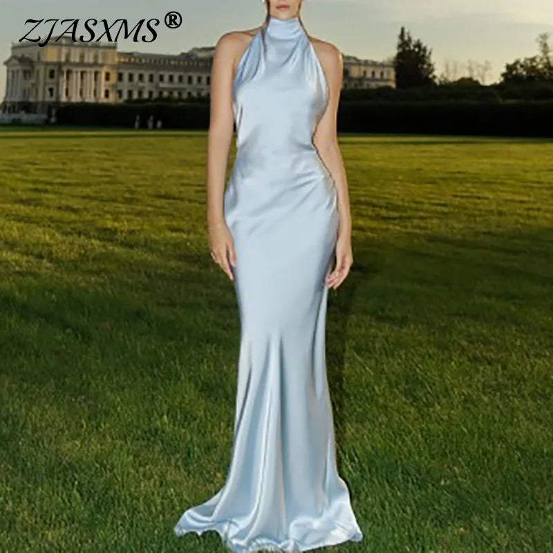 Robes Woman Elegant Solid Satin Party Dresses Spring Halter RIbbons Backless Maxi Dress Summer Hollow Sleeveless Slim Long Dress
