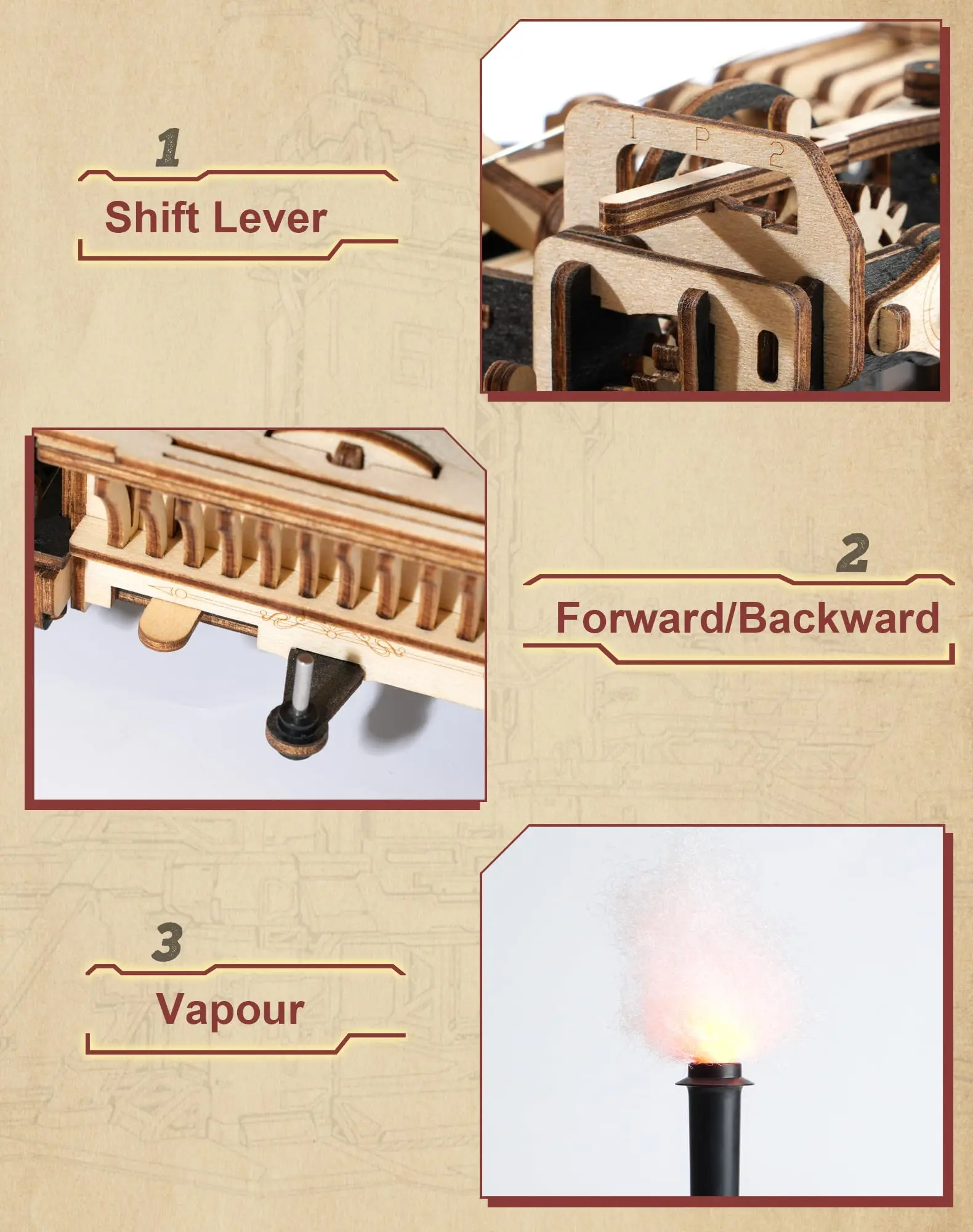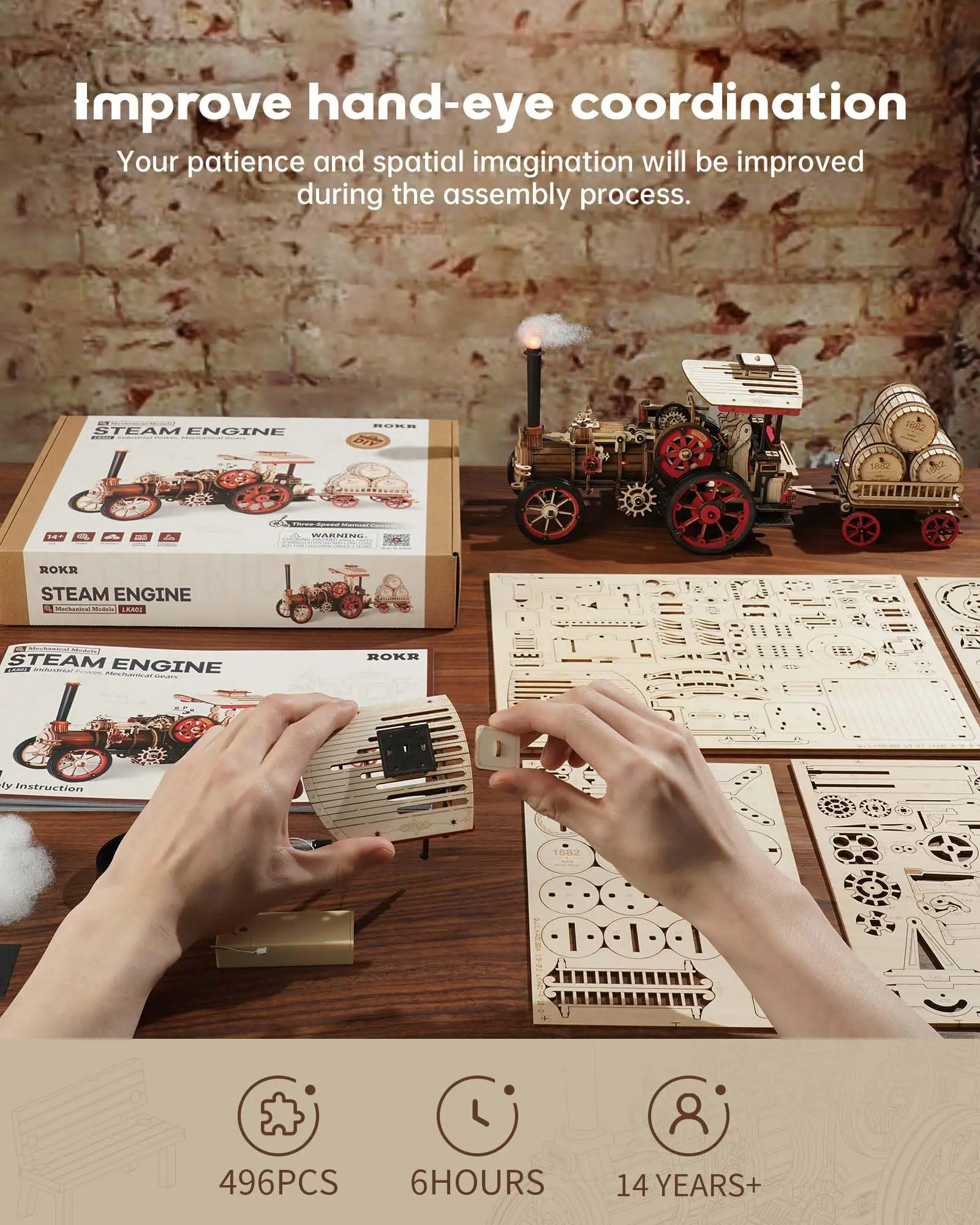 Experience the nostalgia of the steam era with ROKR's first EV model—a meticulously crafted 3D wooden puzzle replicating a steam locomotive at a 1:28 scale.