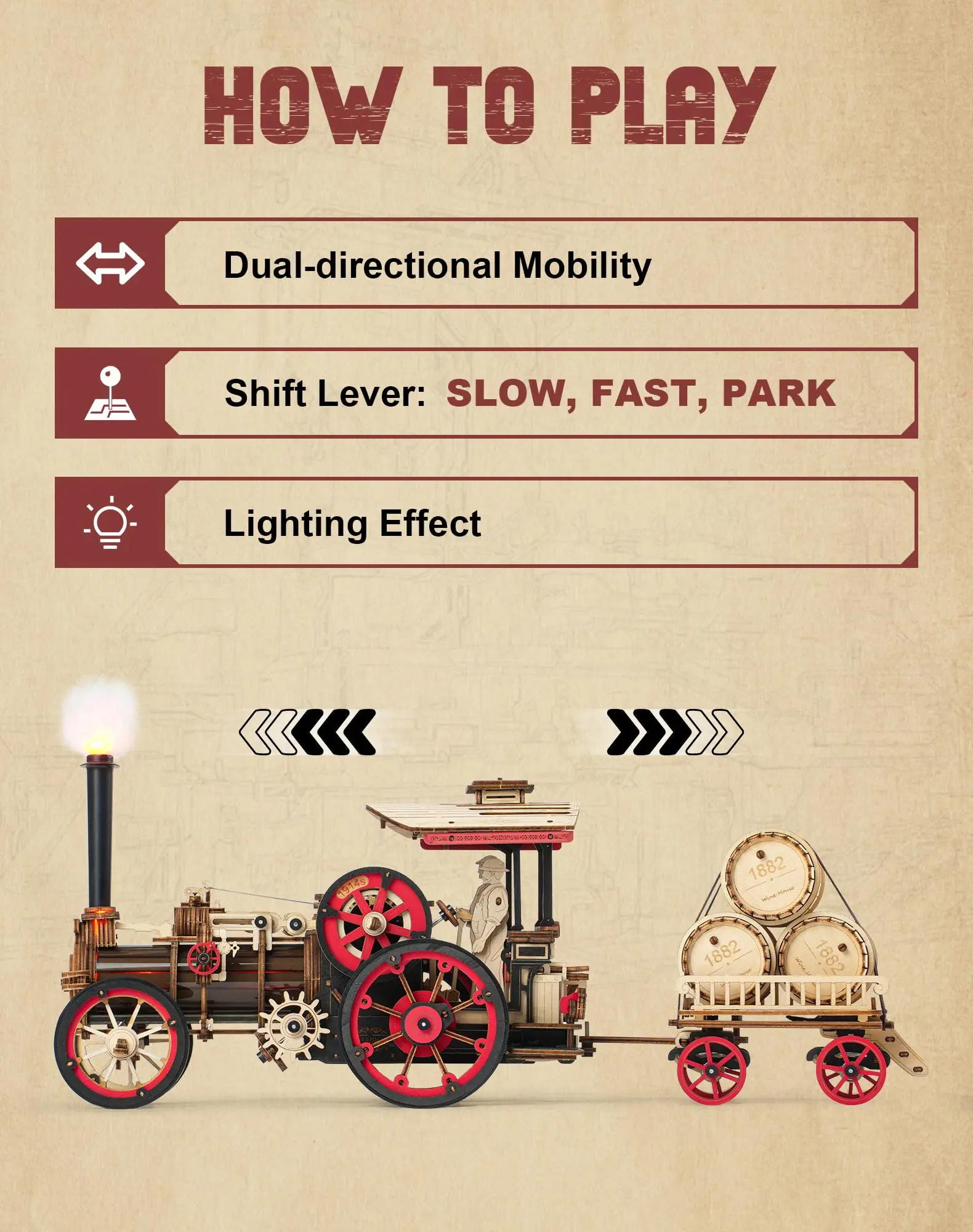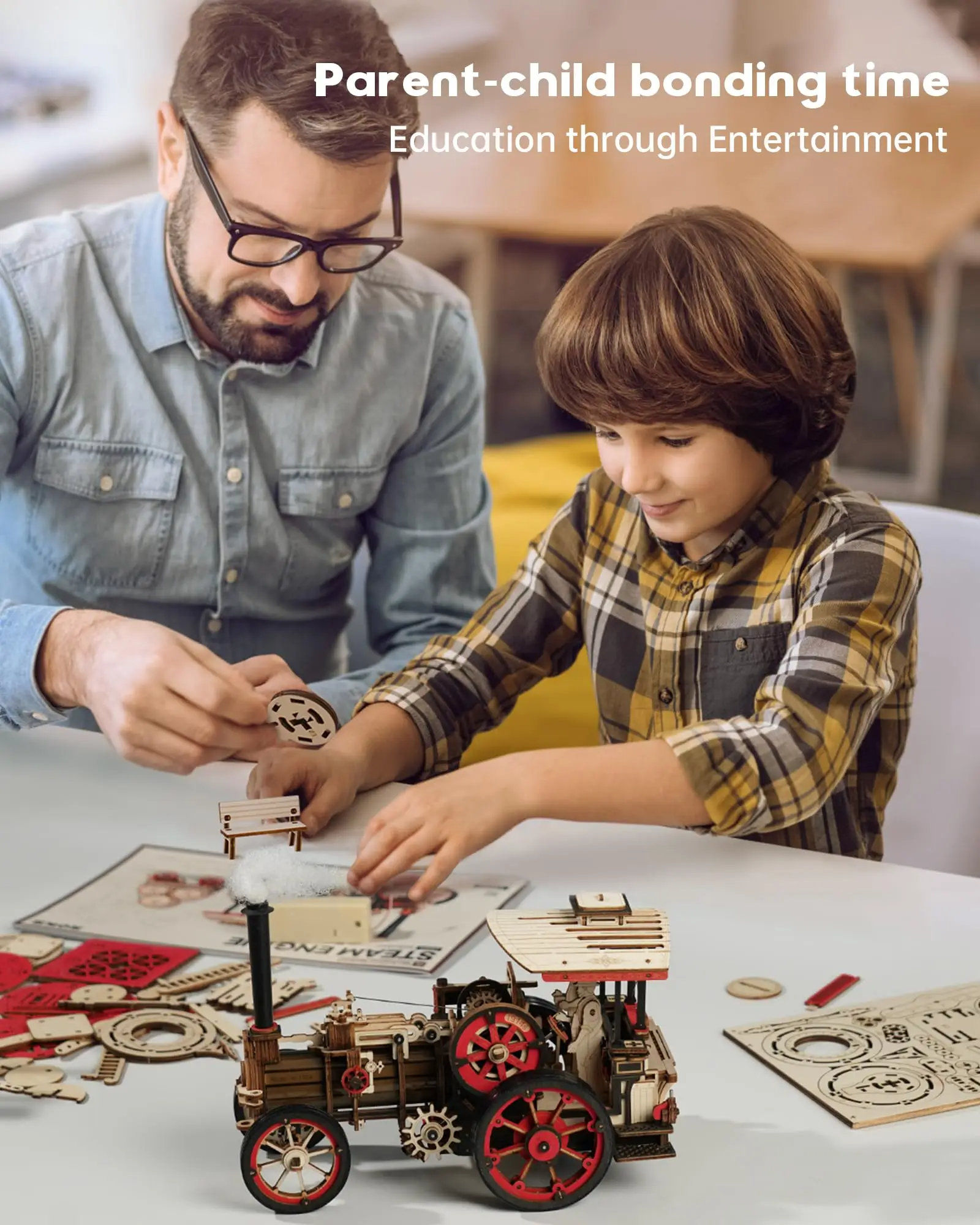 Dive into the joy of assembly with 469 laser-cut wooden parts, accompanied by a comprehensive manual and all necessary accessories. In just 5 hours, watch as this retro-style steam engine tractor takes shape before your eyes, measuring a striking 14x4.7x5.7 inches upon completion.