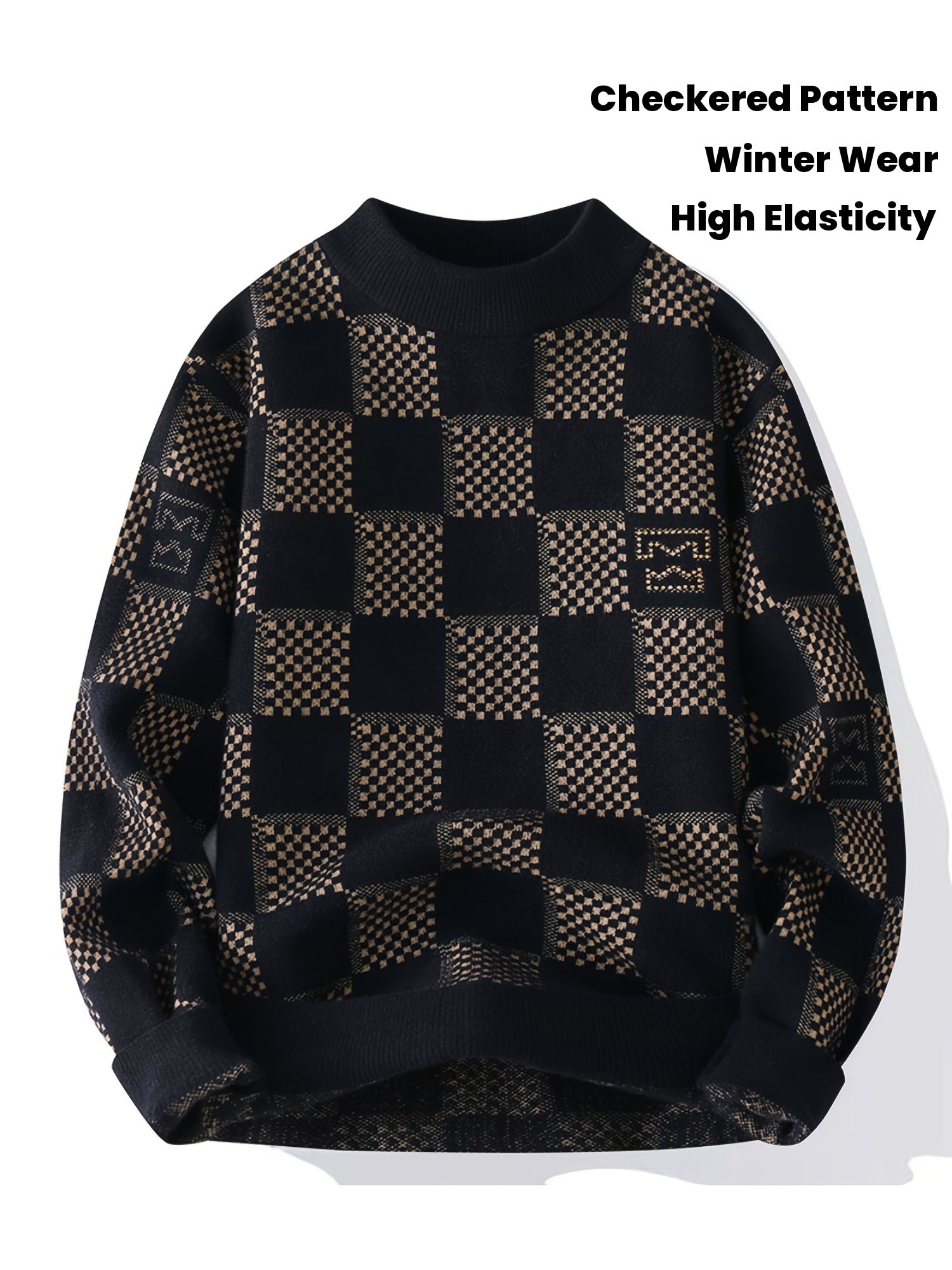 SENMEIGUO Men's Slim Fit Thermal Knit Sweater - Black & White Checkered Pattern, High Elasticity Round Neck Long Sleeve Pullover for Autumn Winter Casual Wear, Winter Sweater, Autumn Wardrobe, Modern Checkered, Comfortable Winterwear