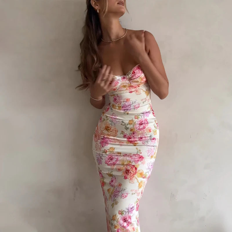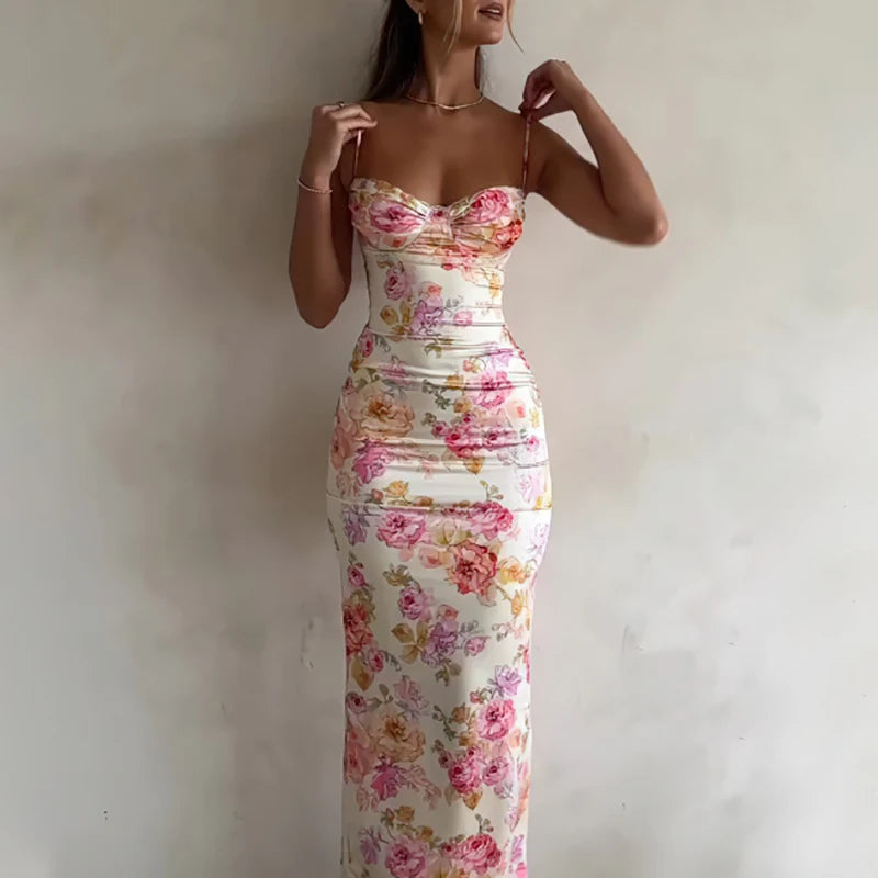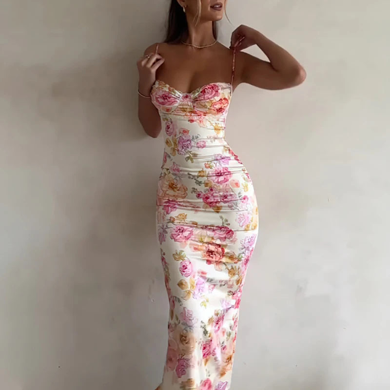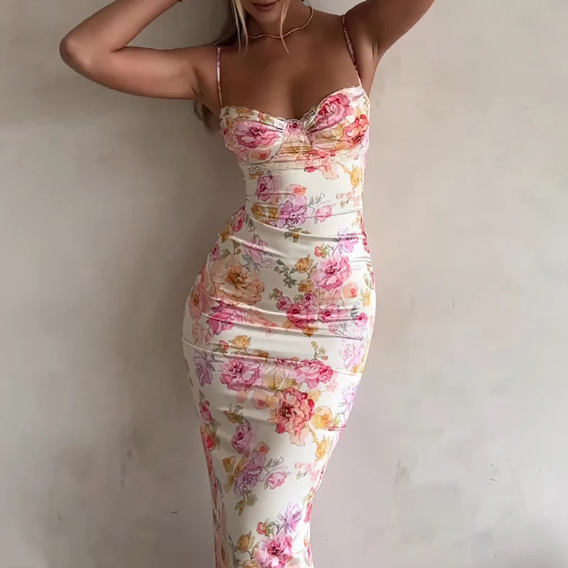 Summer Flower Print Sleeveless Straps Dress Women Sexy V Neck Lace Slim Bodycon Long Dress Spring Hollow Out Night Party Dresses
