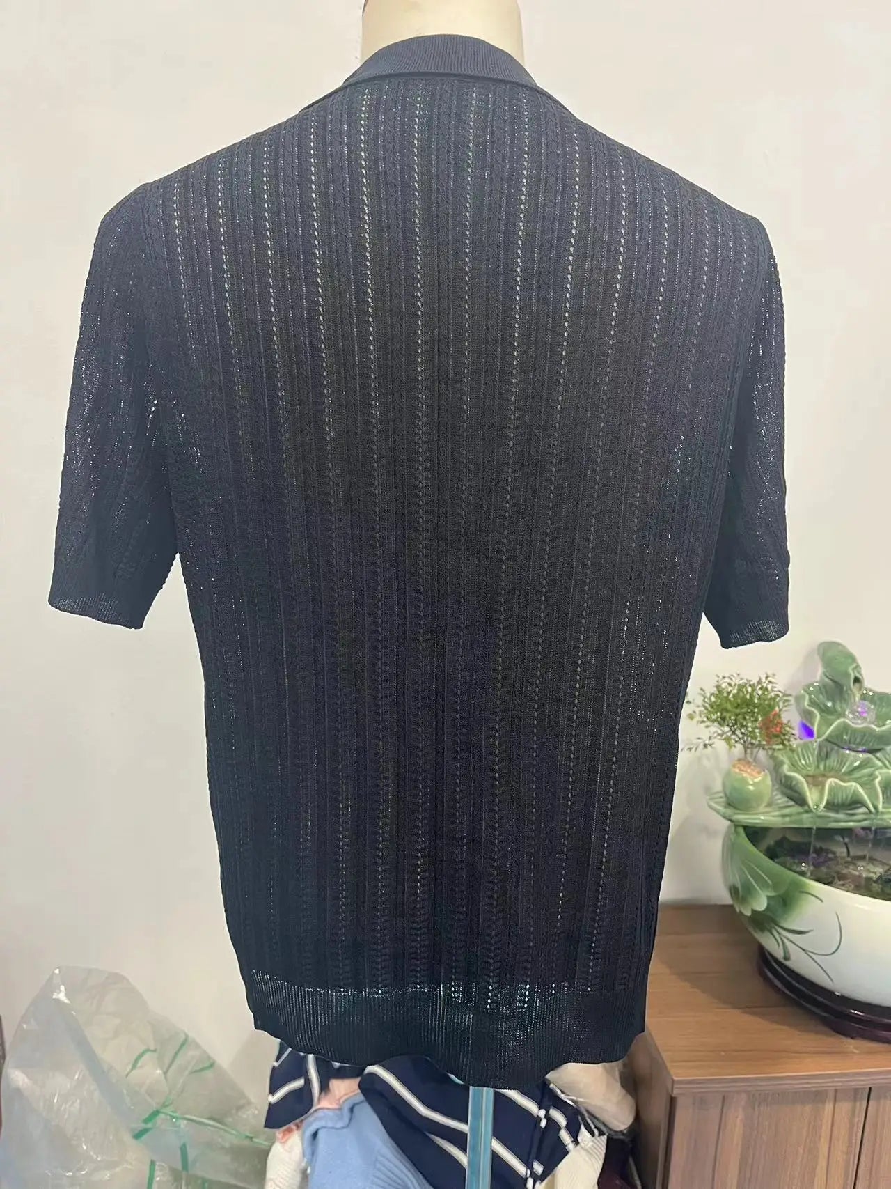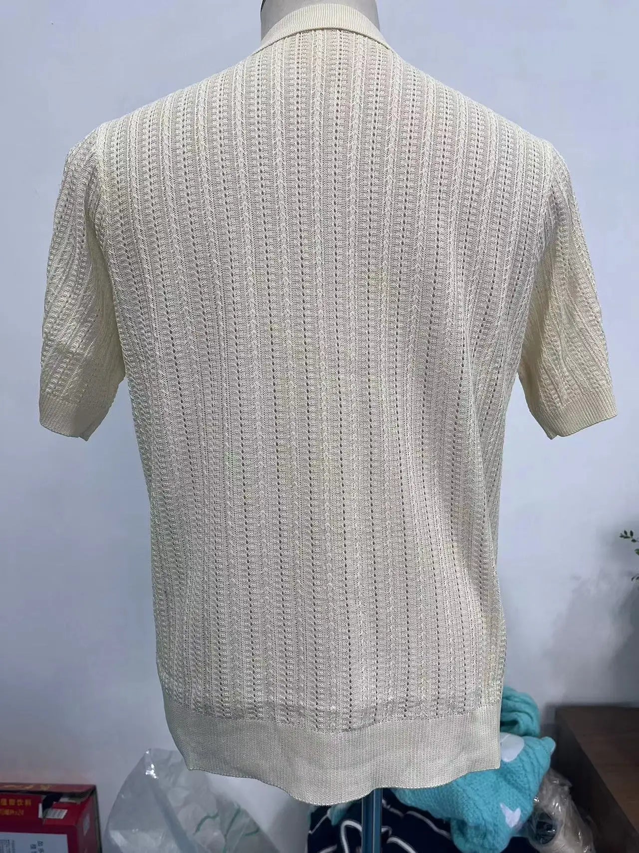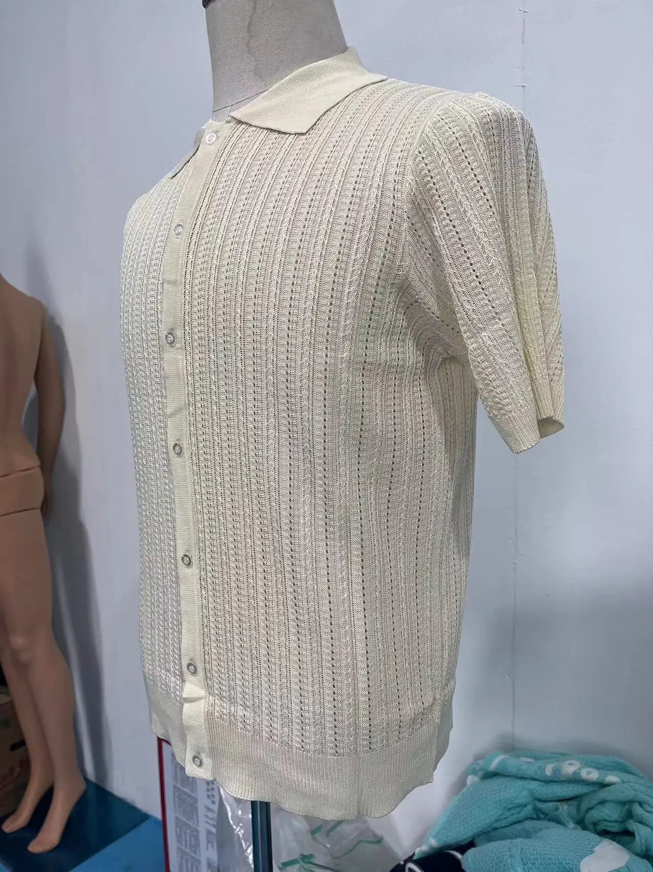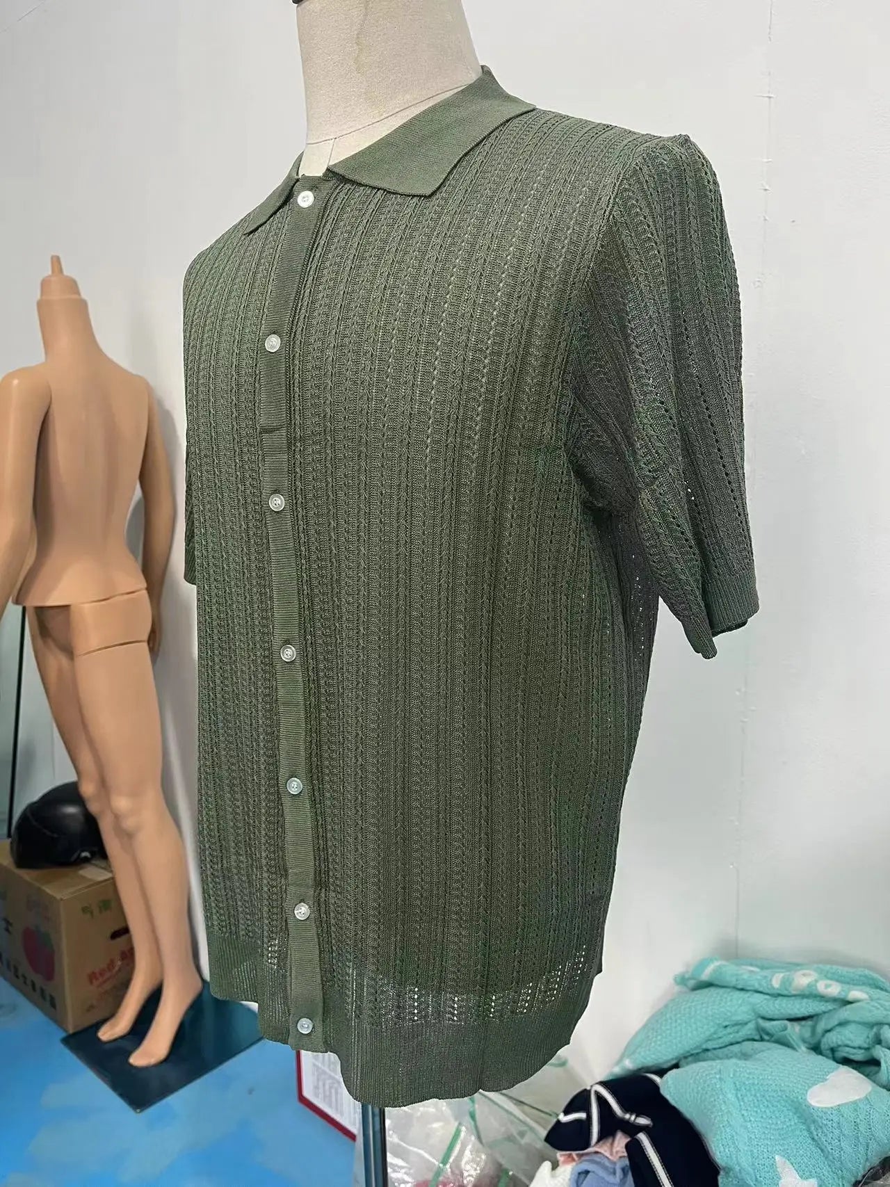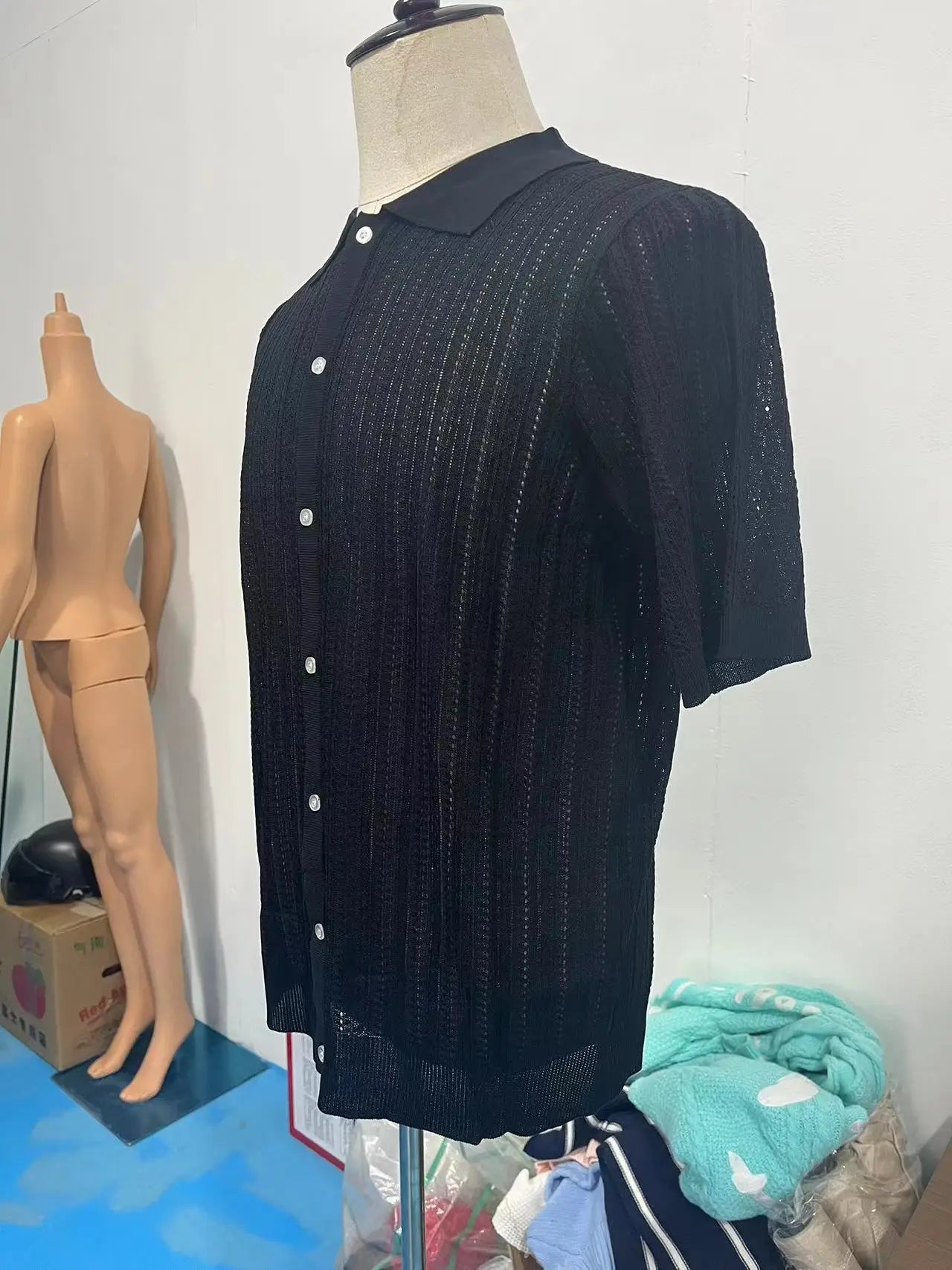 Summer Men's Casual Shirt Breathable Hollow Out Knit Shirt Short Sleeve Lapel Lightweight Top for Men European American Loose