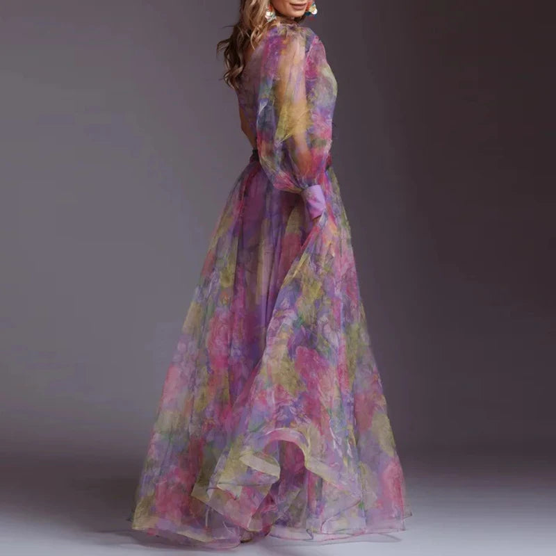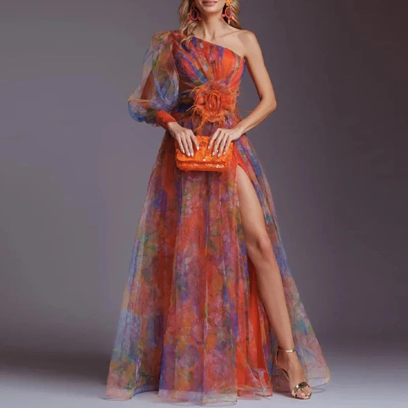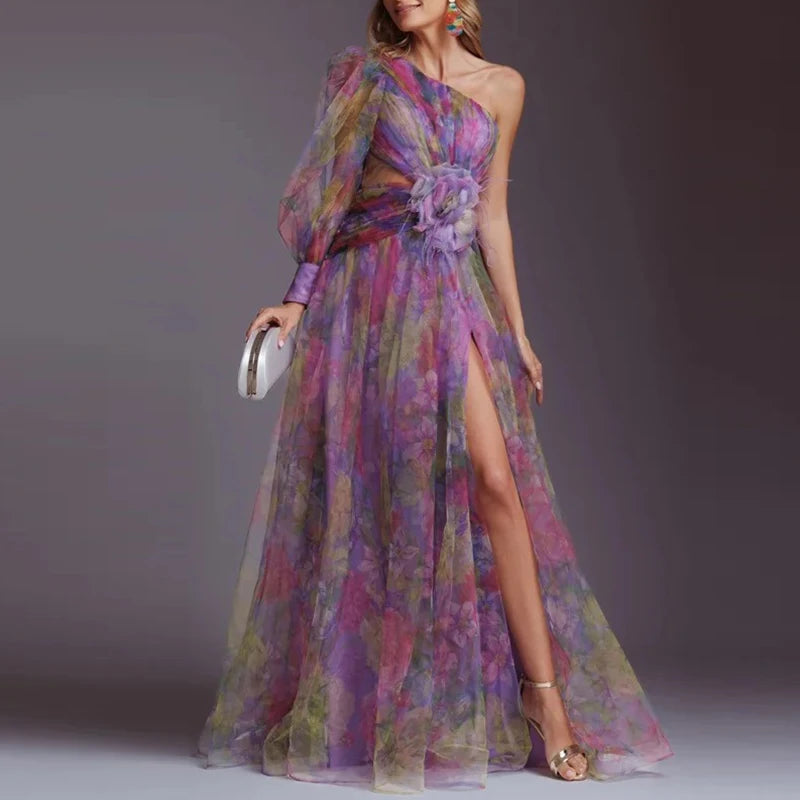 Women Elegant Split Hollow Party Dress Fashion Contrast Print Mesh Maxi Dress Sexy One Shoulder Long Sleeve Irregular Long Dress