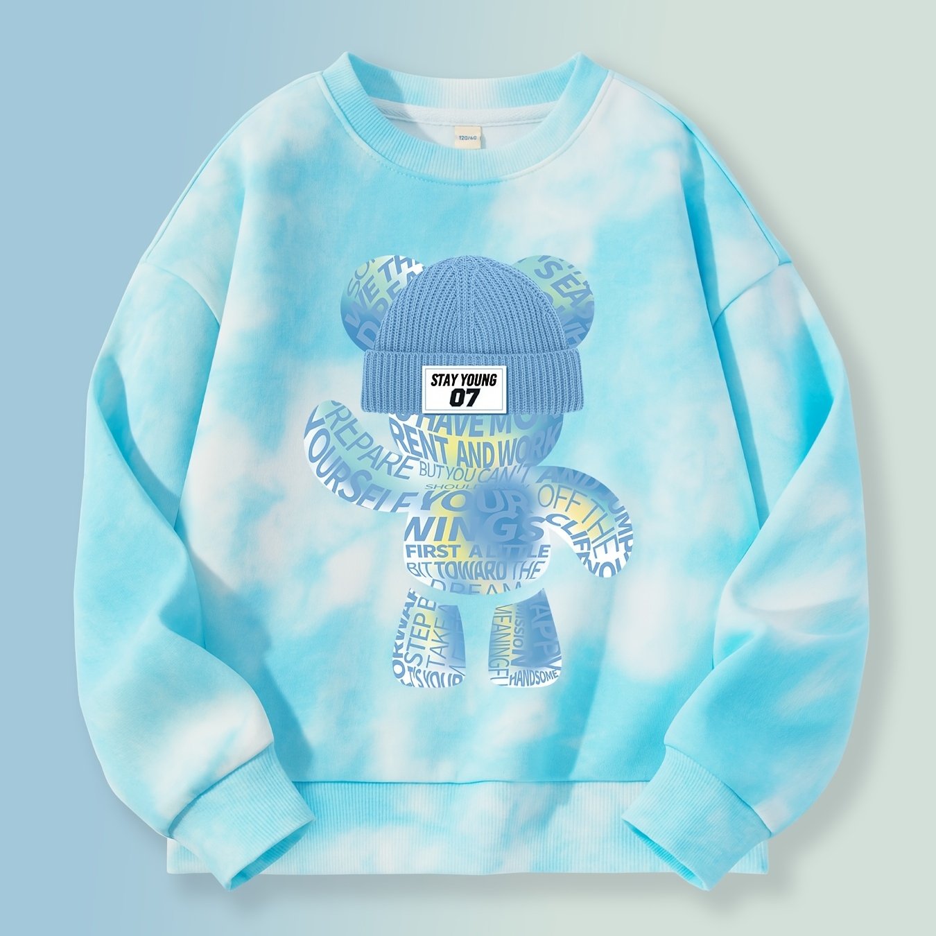 WonderKids Boys' Spring/Autumn Fashion Tie-Dye Round Neck Sweatshirt with Cartoon Bear Print, Perfect for Outdoor Casual and Sports Wear