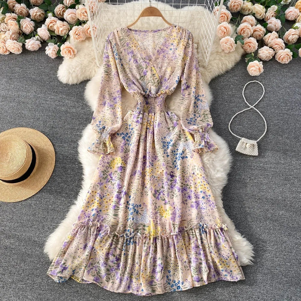 YuooMuoo 2025 Spring Summer Long Sleeve Chiffon Dresses Fashion Female Elastic Waist Pleated Long Dress Women Print Floral Dress